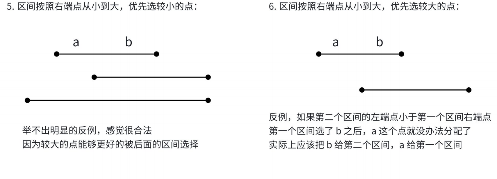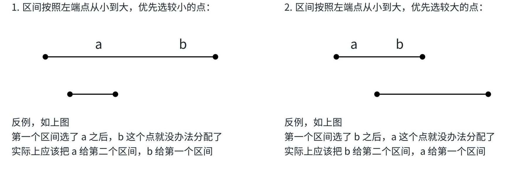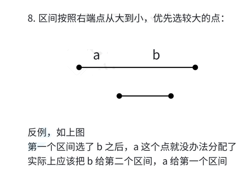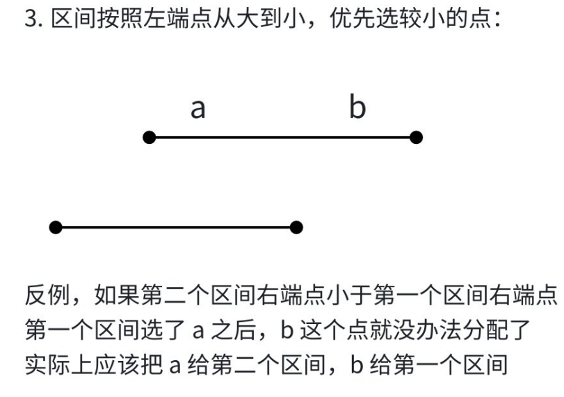 因此我们大胆断定,对于两条区间,我们选择右端点较小的那个是最优解
