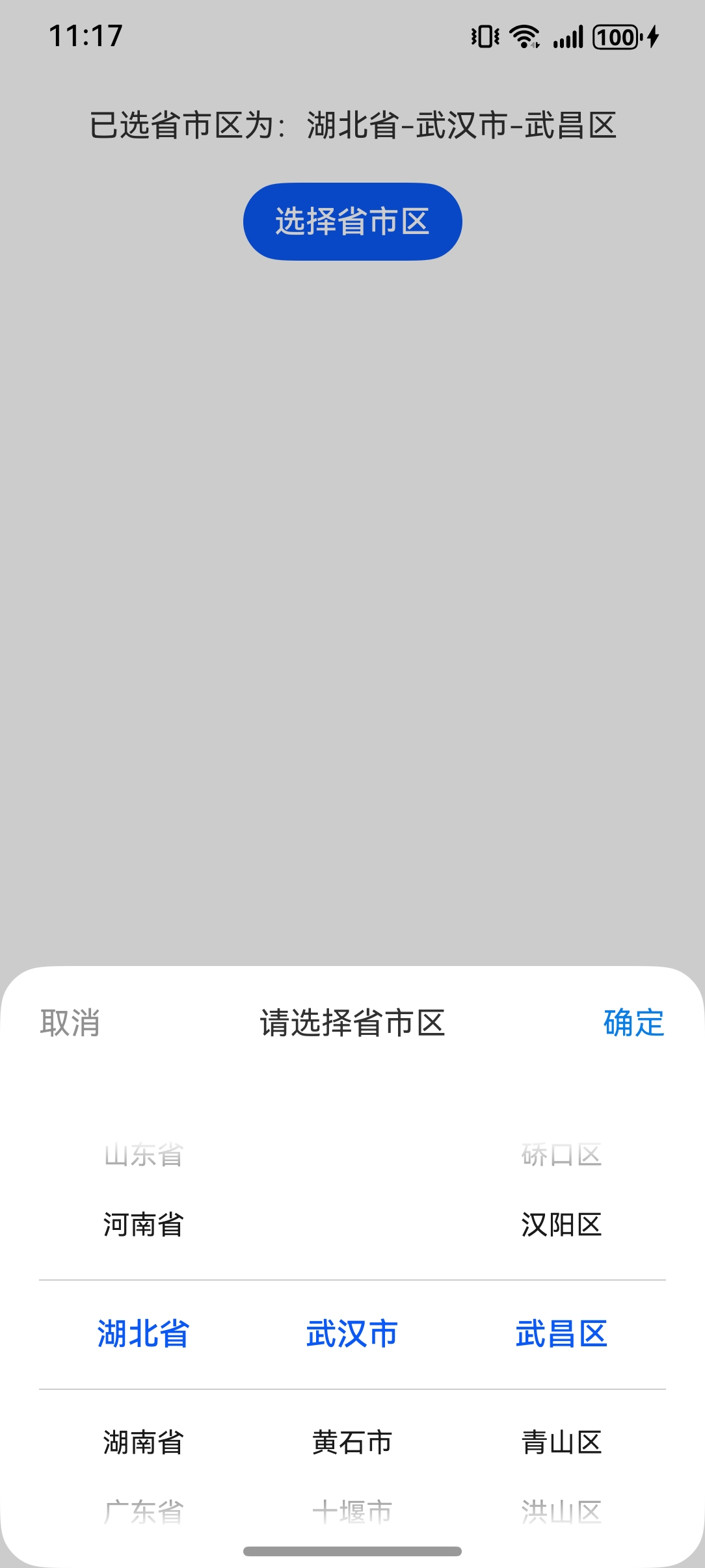 @State pickerValue: string[] = ['湖北省', '武汉市', '武昌区'] //省市区默认选中值