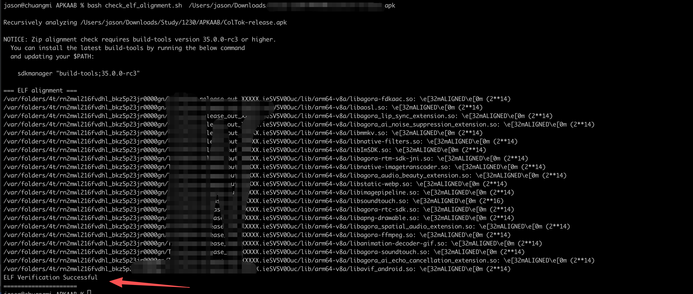 使用官方提供的check_elf_alignment.sh脚本,验证共享库的ELF段是否使用16 KB ELF对齐方式正确对齐。