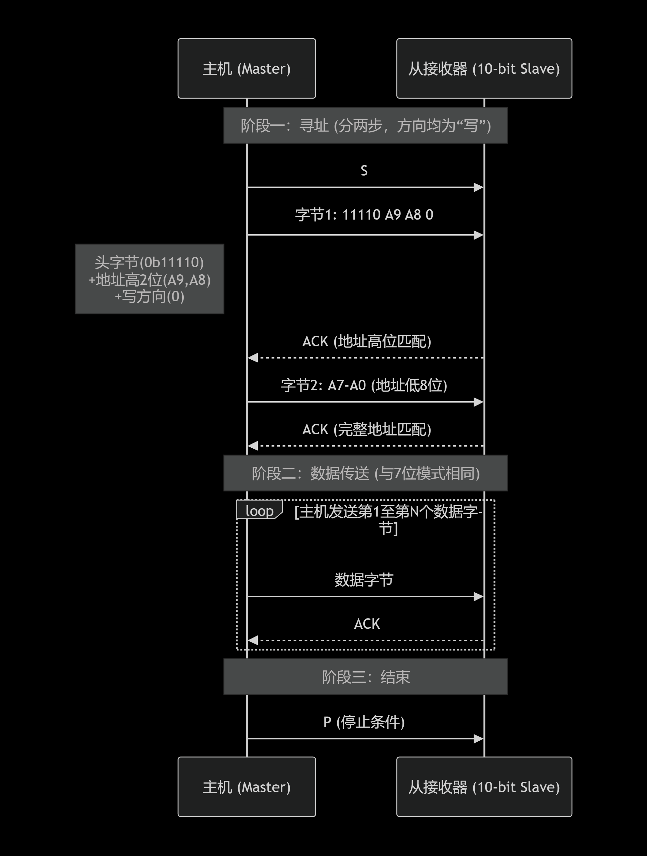 11110前缀),再发送地址的低位部分(第二个字节)。两个字节的方向位都是"写"(0)。 - 无重复起始 :与10位地址的读操作 不同,写操作 在完成两段式寻址后,直接进入数据传送阶段,不需要重复起始条件。因为方向从一开始就是明确的(写)。