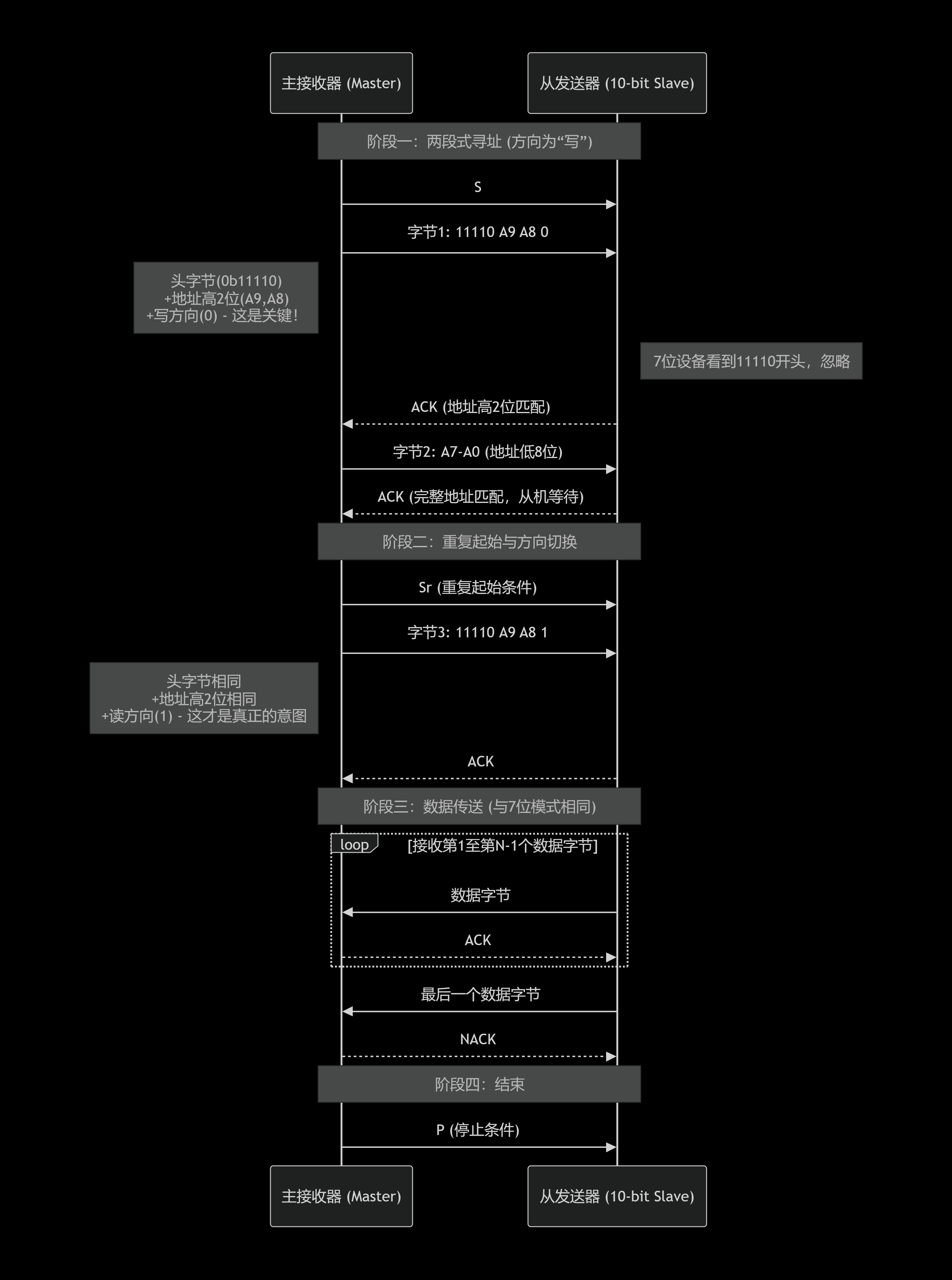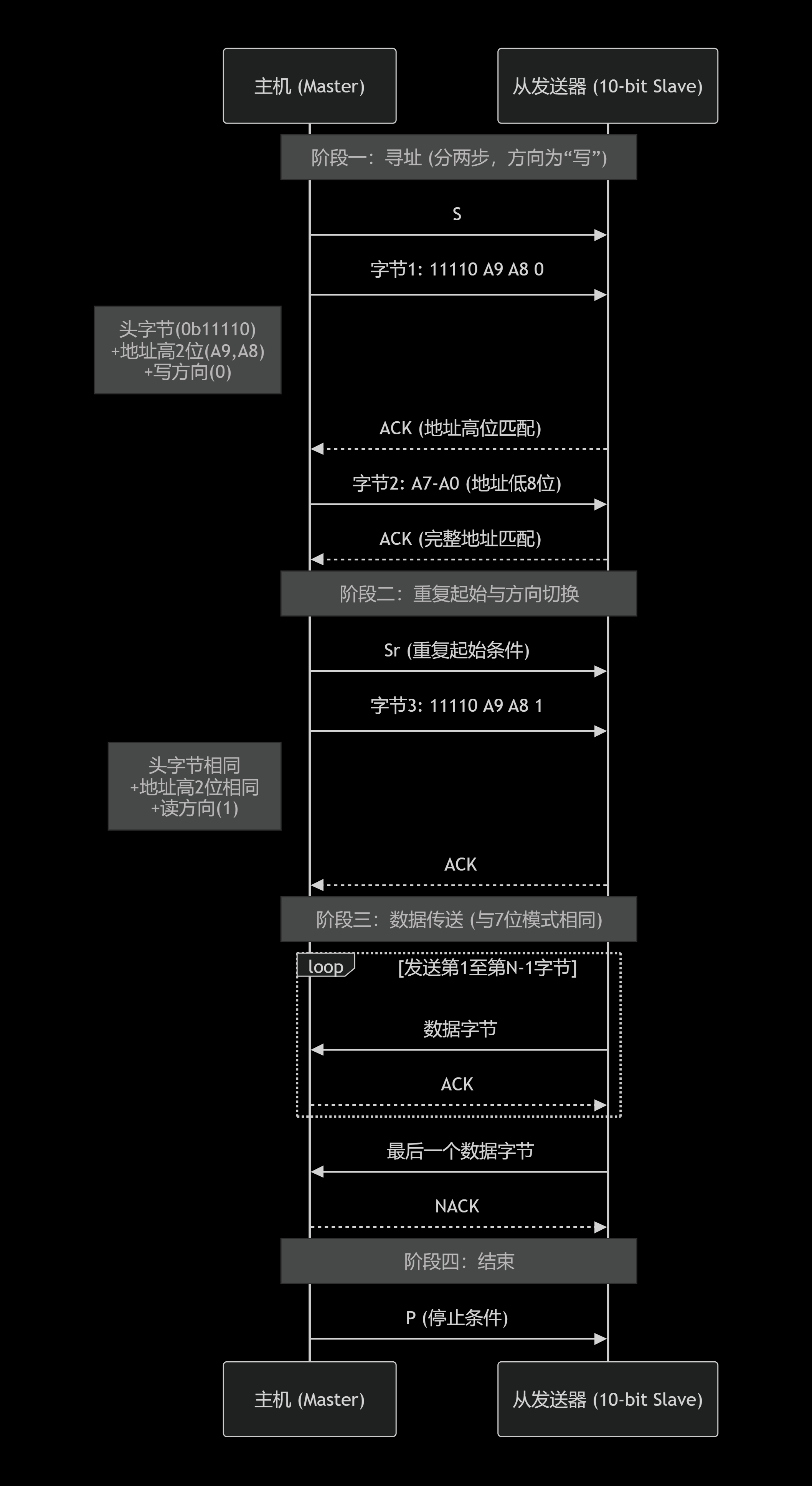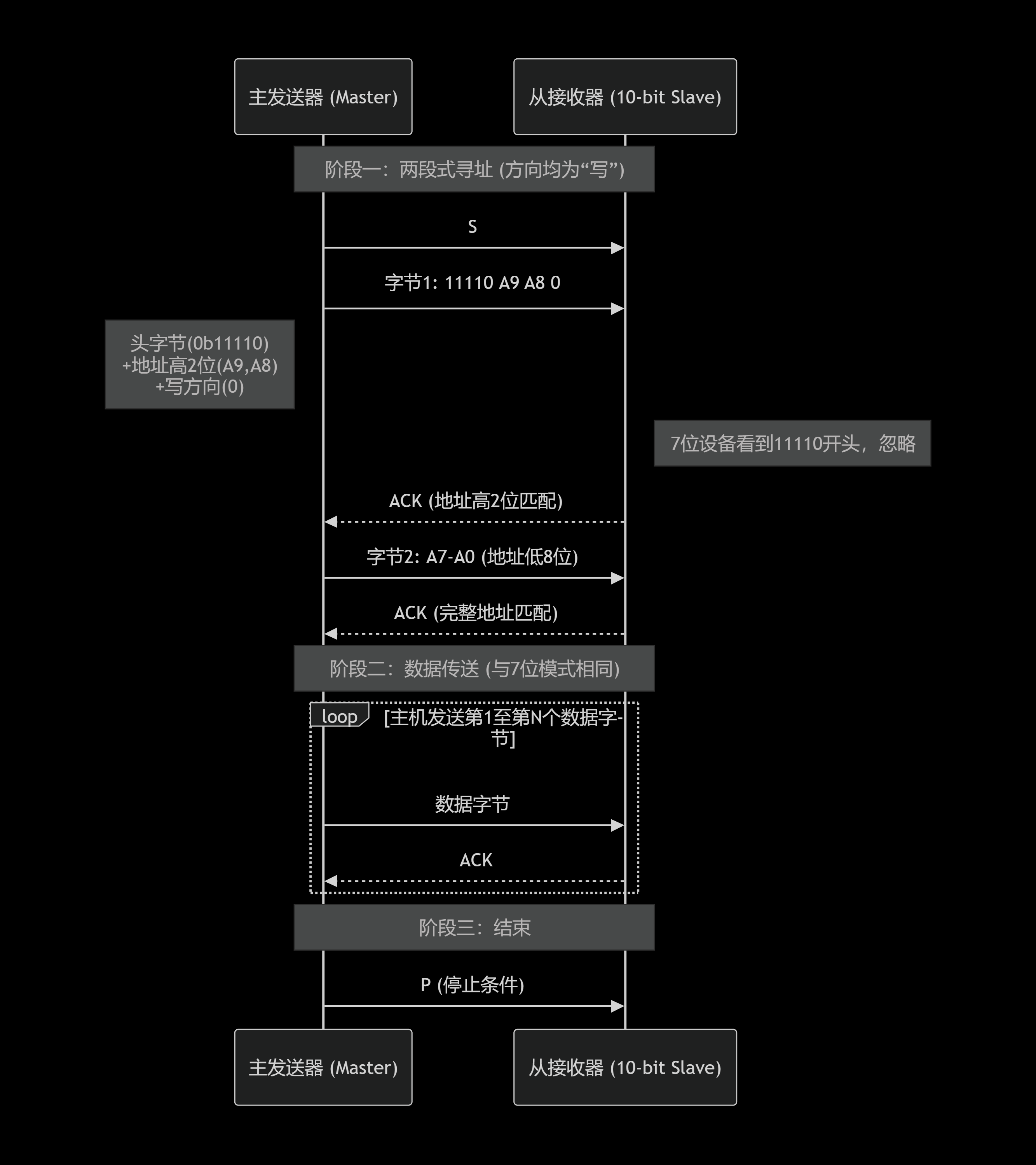 - 两段式寻址 :主机先以写方向(0) 发送10位地址(分两个字节)。这确保了总线上的7位地址设备会因首字节