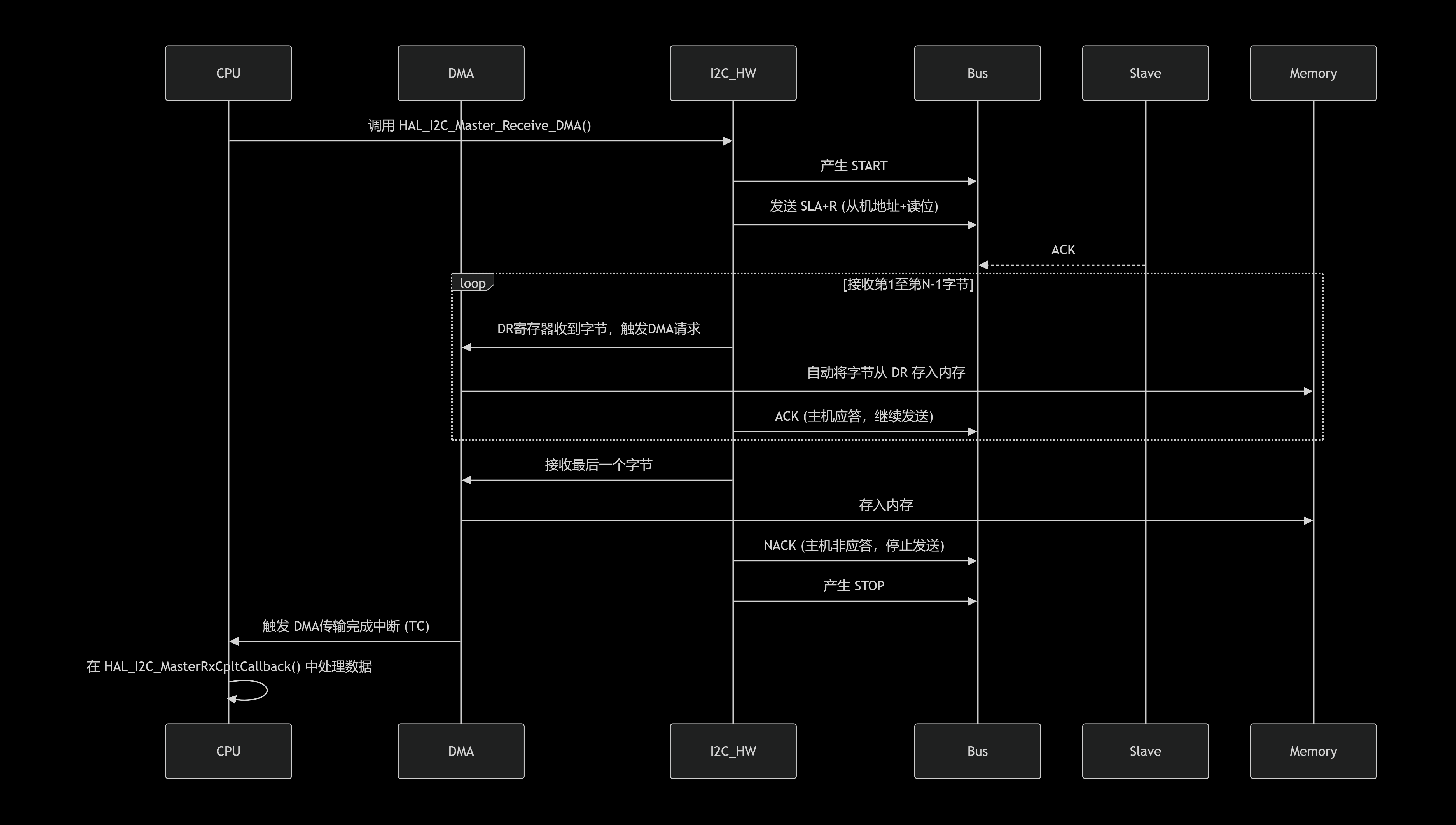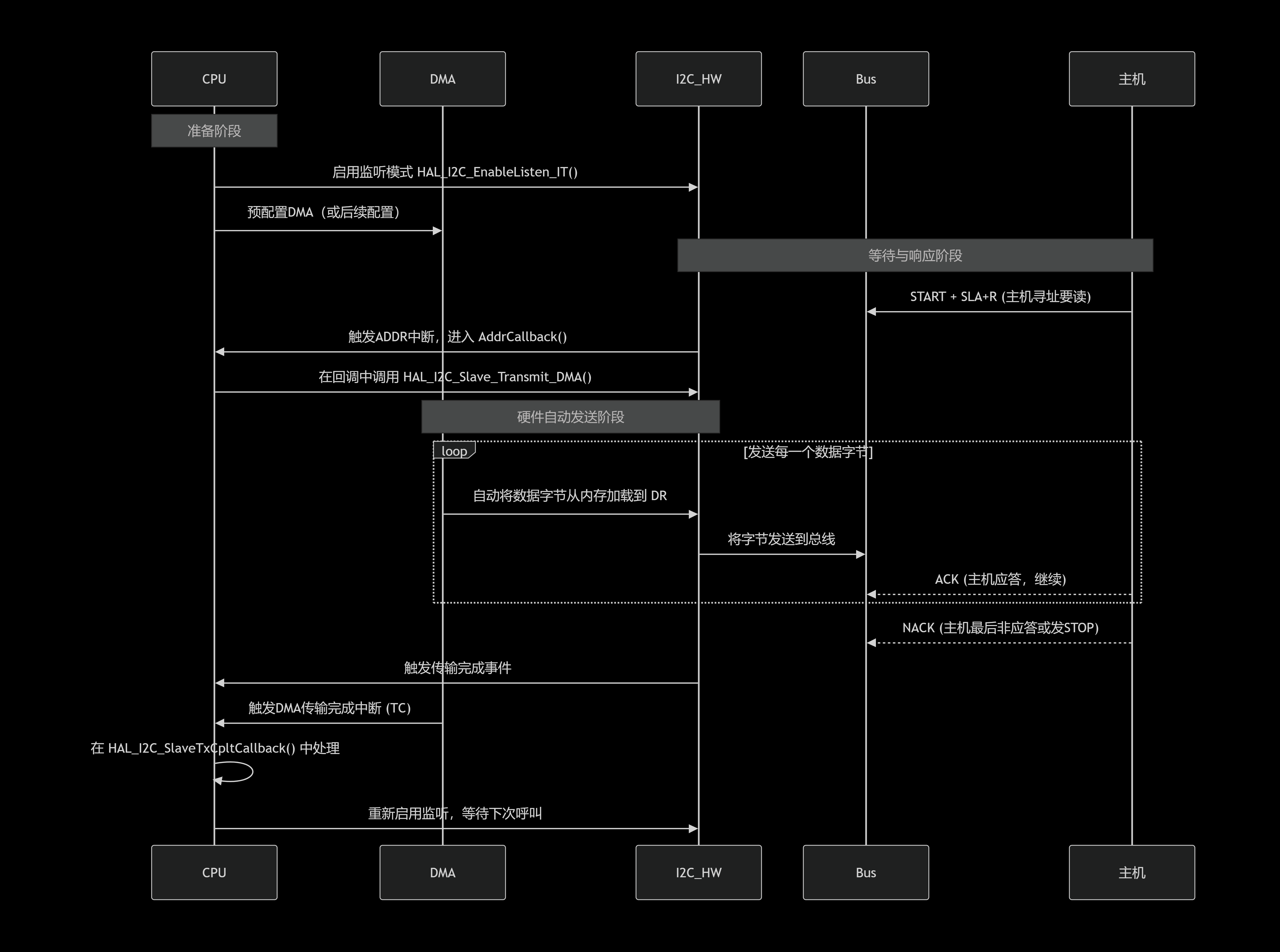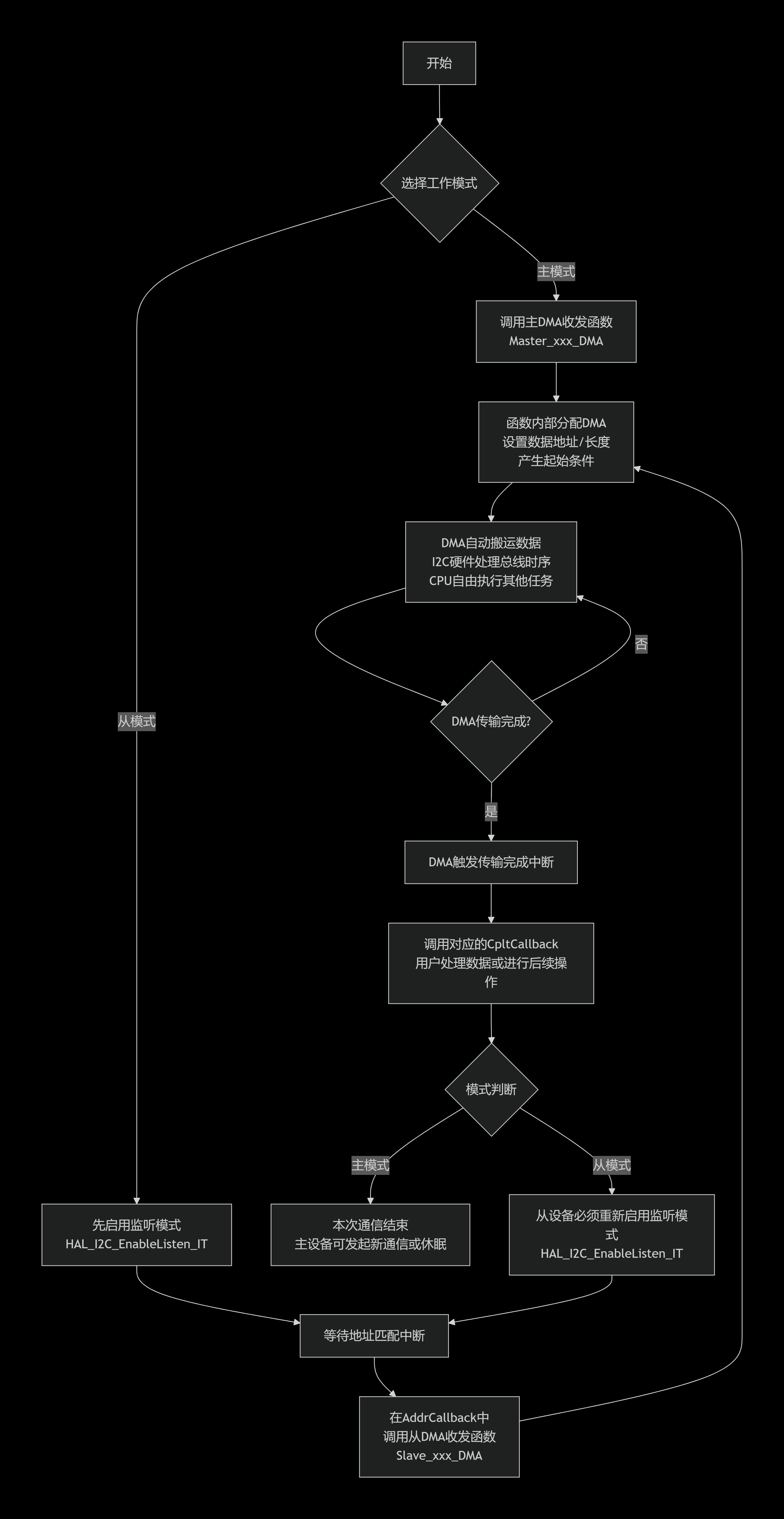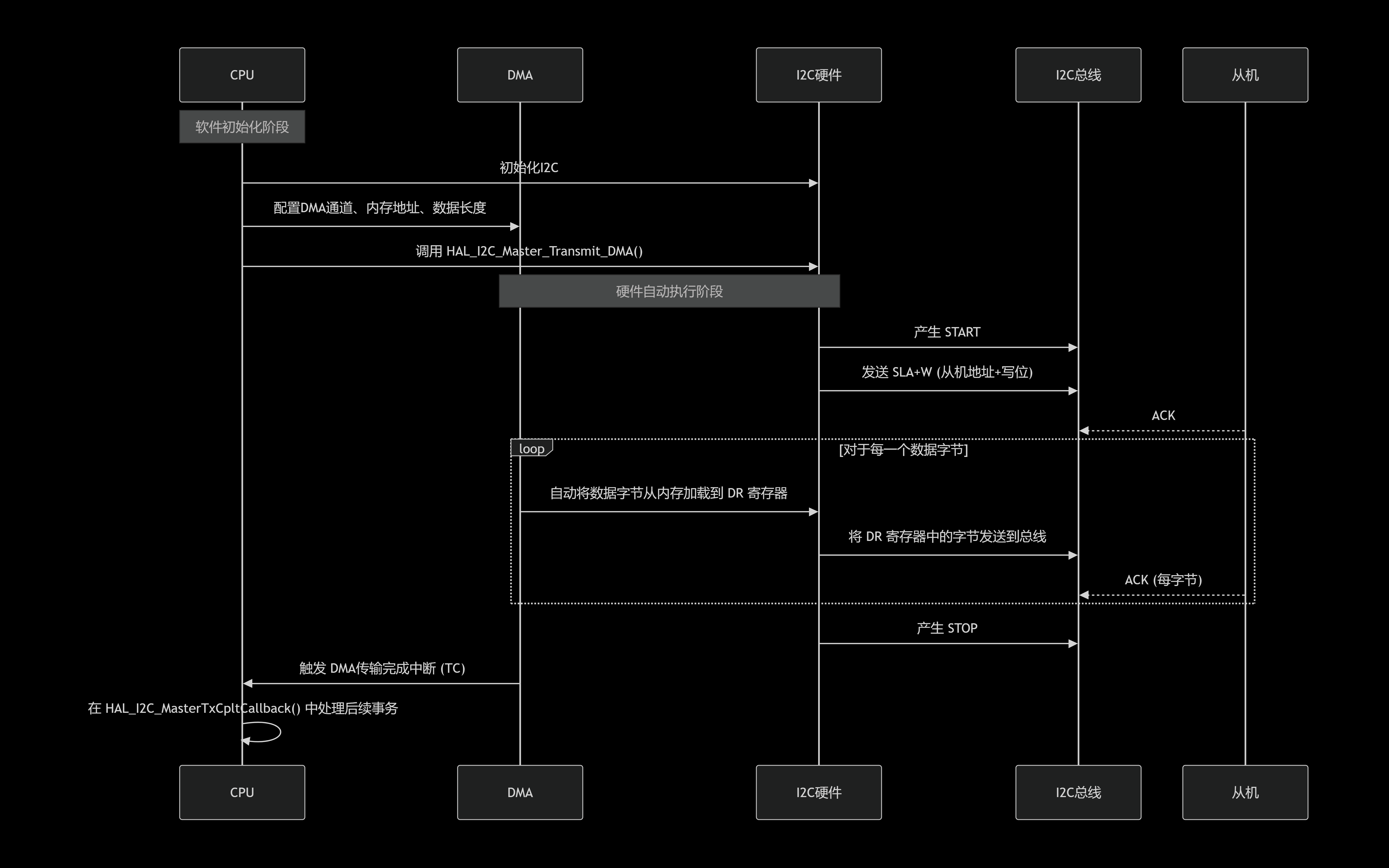 关键点:主模式DMA发送由一次函数调用启动,整个数据块的搬移和发送完全由DMA和I2C硬件协同完成,CPU仅在最后收到一次完成中断。