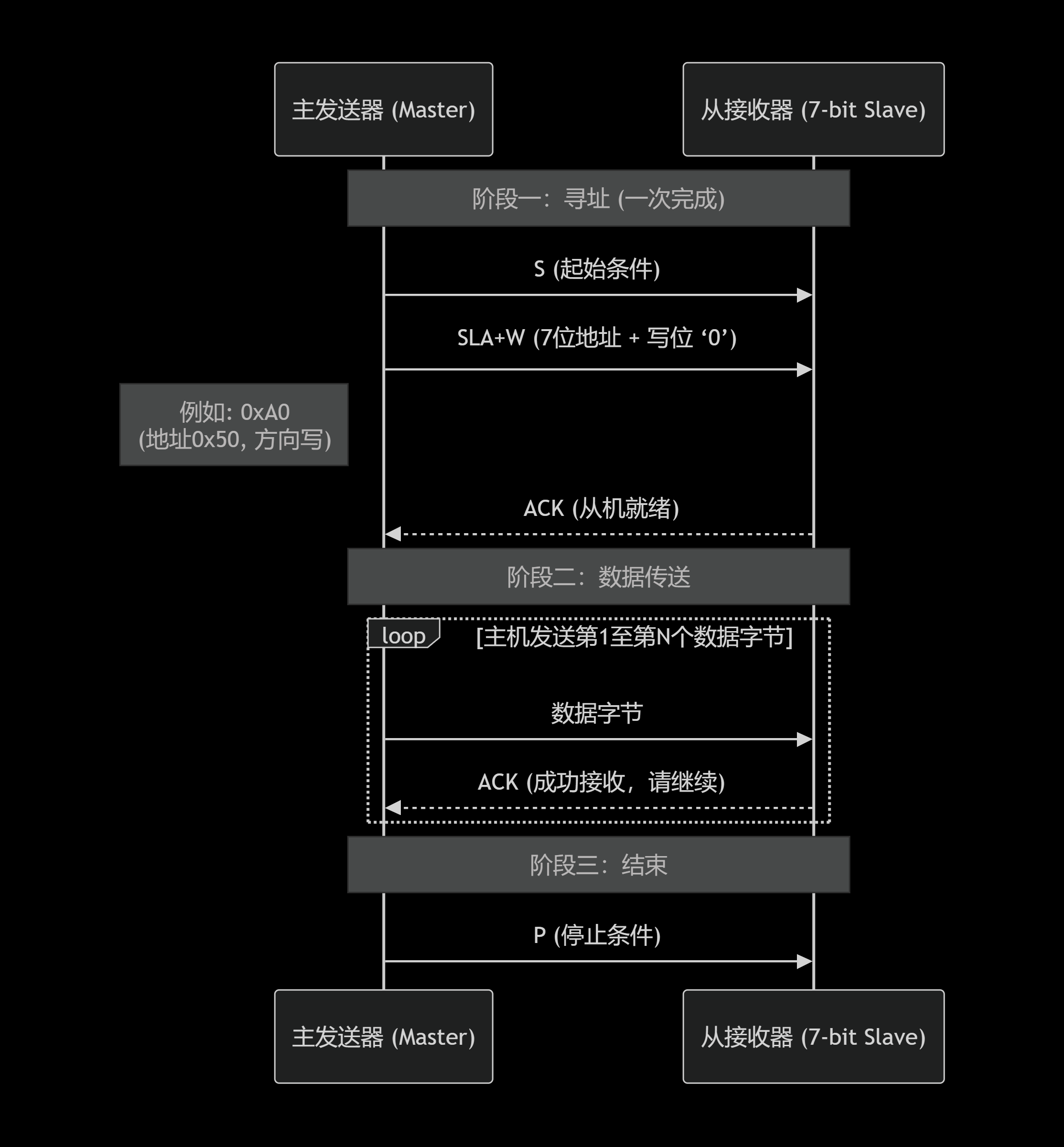 7位地址核心特点 :寻址一步完成。主机发送的第一个字节 SLA+W 同时指定了目标从机和"写"操作。