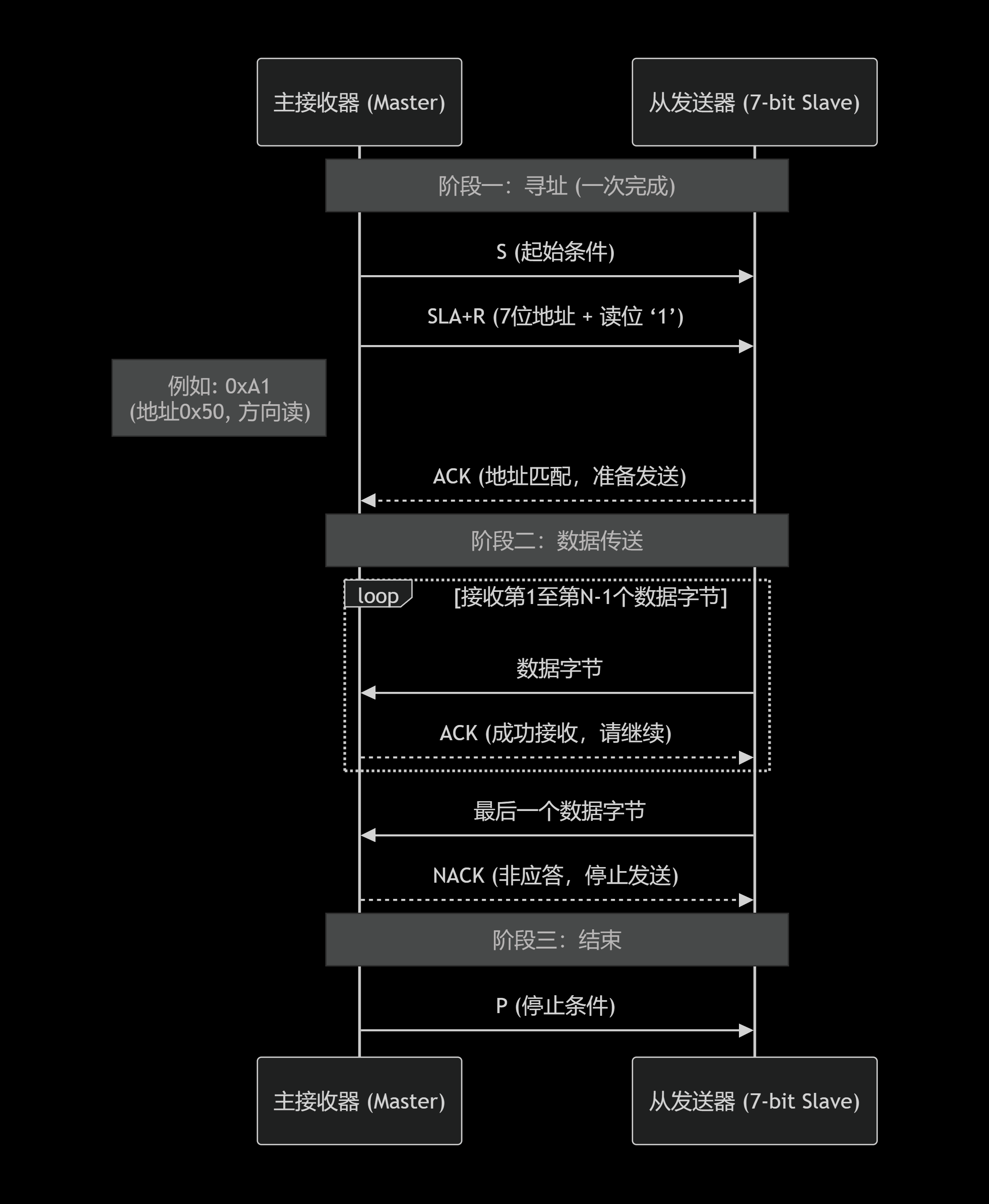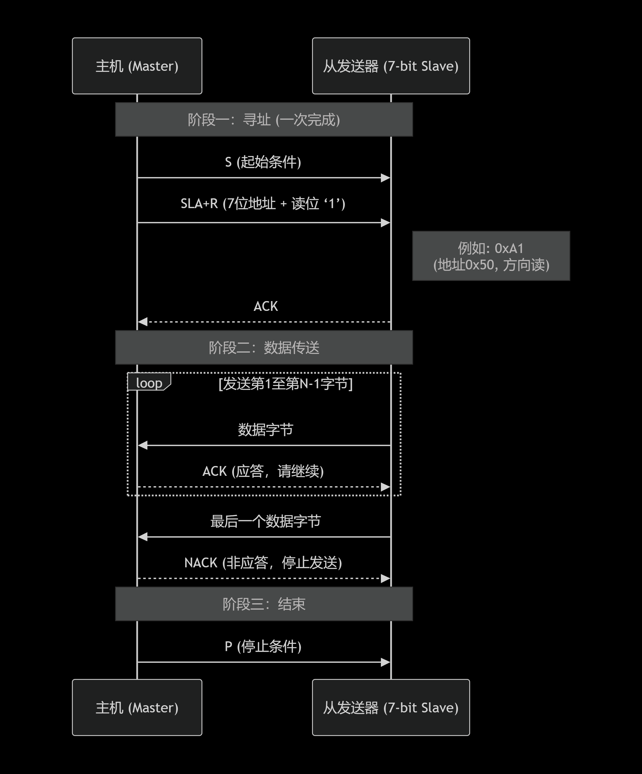 11110不是自己的地址而保持静默。 - 重复起始条件 :在从机应答完整地址后,主机不发送停止信号,而是立即发送一个重复起始条件(Sr) ,然后再次发送地址头,但将方向位改为读(1)。这才是真正的"开始读取"指令。