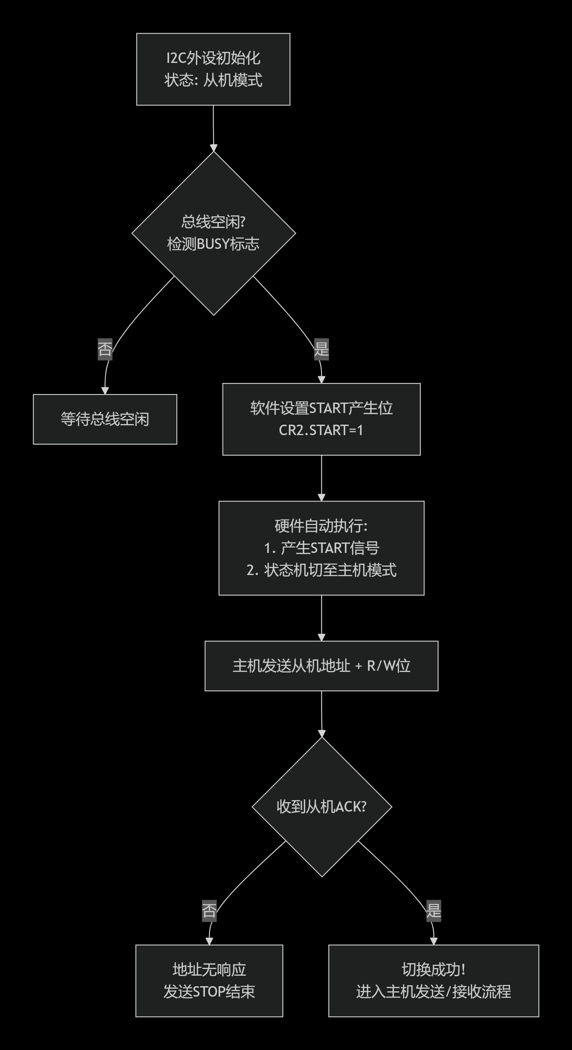 STM32F103的I2C外设内部有一个硬连线状态机。它的默认状态(复位后或总线空闲时)确实是从模式(Slave) 。它始终在监听总线,等待自己被寻址。只有当它主动在总线上发起一个起始信号(START condition),其内部状态才会从"从机接收器/发送器"转变为"主机发送器/接收器"。