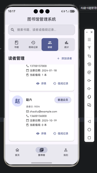 - 读者信息展示:包括姓名、编号、邮箱、电话等基本信息。