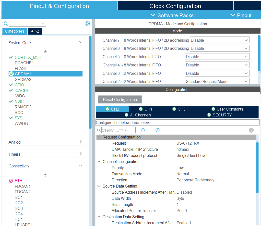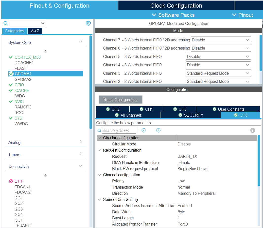 本次的 CubeMX 基础配置与此前保持一致,仅需新增两路 DMA 通道,以适配双串口的全功能收发需求:新增通道 2 作为串口 2 的接收 DMA 通道、通道 3 作为串口 4 的发送 DMA 通道,具体配置截图如下: