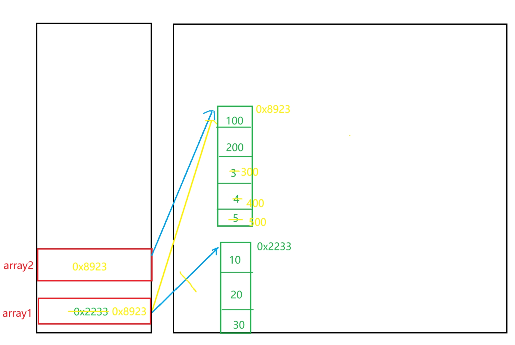 图中array1数组最初指向自己本身创建的对象(蓝色箭头),元素分别是10,20,30;array2数组也是如此, 元素分别是100,200,3,4,5;看第11行代码array1 = array2; 执行这一行的意思就是将array2数组存放的地址赋值给array1,因此array1数组指向了地址为0x8023这个对象(荧光色箭头),而地址为0x2233这个对象则会被JVM自动回收,原因就是没有引用指向它了,所以第12,13,14行代码操作的数组其实是array2,而不是array1。最终输出100 200 300 400 500