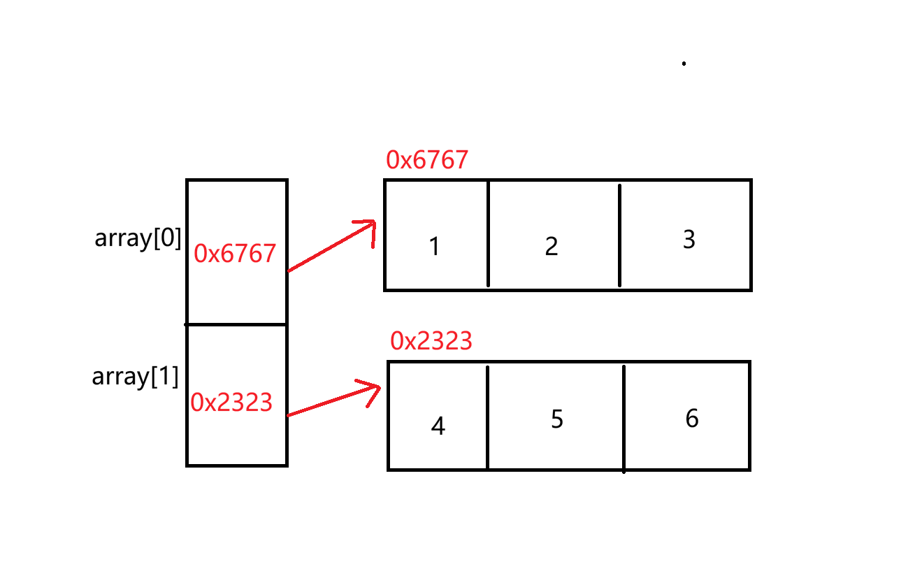 由图可以知道:二维数组array存放了两个一维数组,分别是array[0]和array[1],array[0]指向了地址为0x6767这个对象,array[1]指向了地址为0x2323这个对象。所以array.length的值为2,因为它存放了2个一维数组,而array[0].length的值为3,因为array[0]是个一维数组,它存放了3个元素。