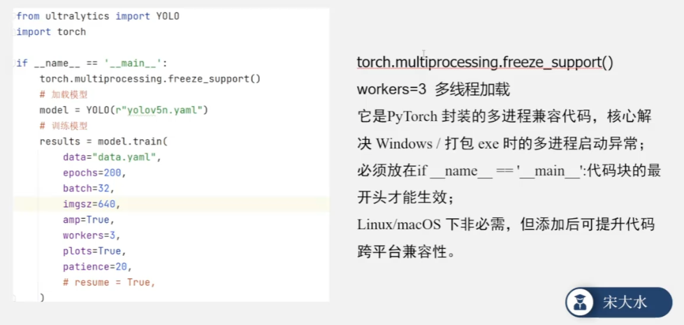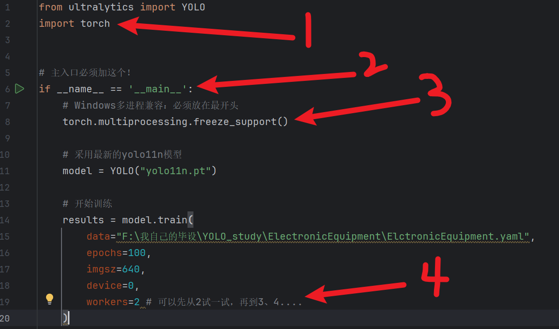 workers>0必须满足用【if __name__ == '__main__':】包裹训练逻辑- 在块的最开头加