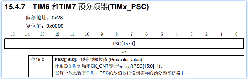 :预分频器寄存器的值,真正的分频系数为PSC+1
