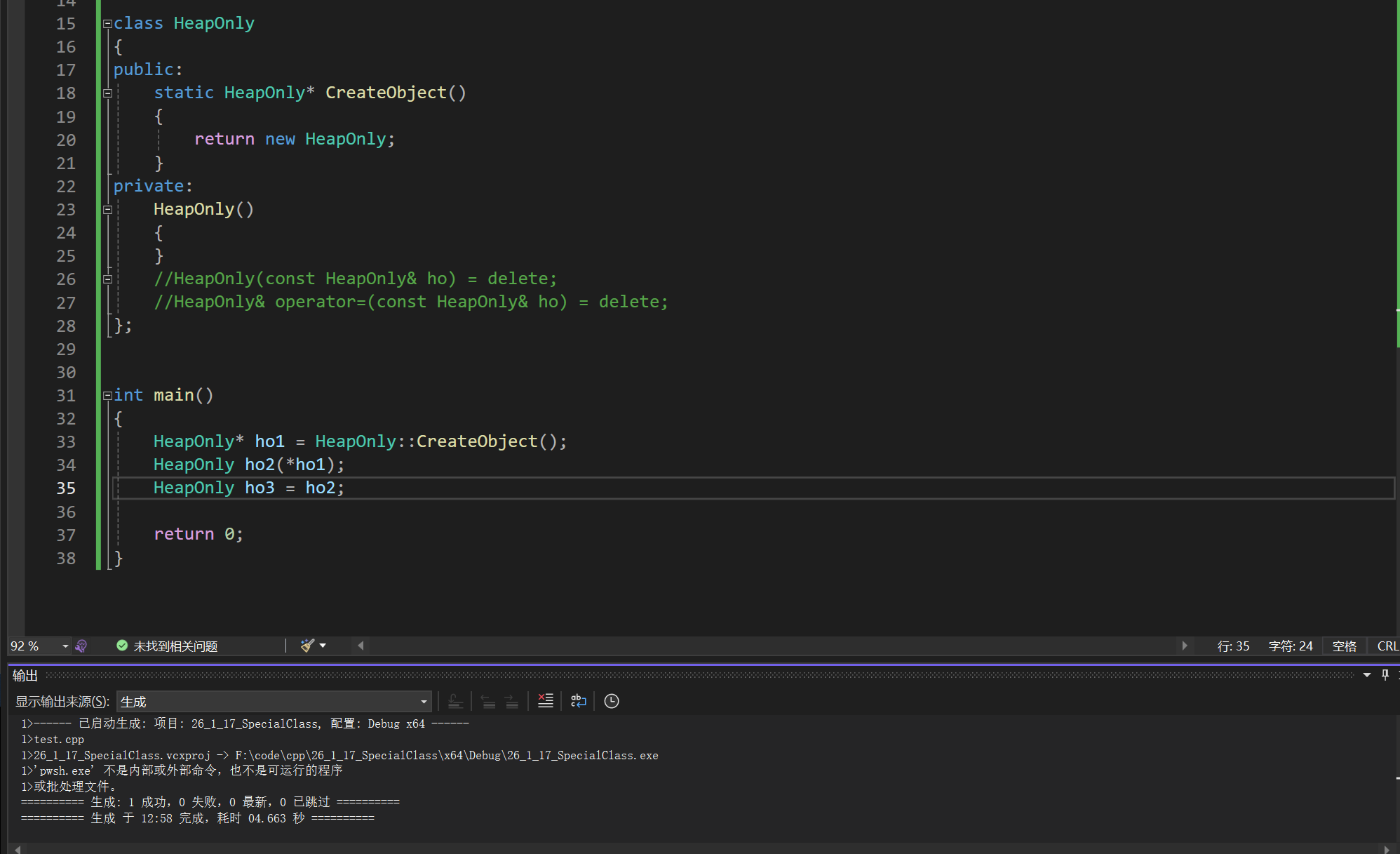 cppclass StackOnly { public: static StackOnly CreateObject() { return StackOnly(); } private: StackOnly() { } StackOnly(const StackOnly& so) = delete; StackOnly& operator=(const StackOnly& so) = delete; };这样进行实验是确实可以通过编译的,但是这样进行构建的对象是死的,无法将 CreateObject 函数进行创建出来的对象进行赋值给外面进行接收的对象,这些都是在c++17之前;但是c++17之后是允许通过编译的,之所以能够通过编译是因为这个return StackOnly()这行代码在c++17之前是先进行创建临时对象 ,将临时对象拷贝或者移动到外面接收的变量中,但是c++17之后直接将拿着这个对象中的成员一个一个赋值给外面对象的成员,既然没有临时对象也就不在涉及拷贝构造。