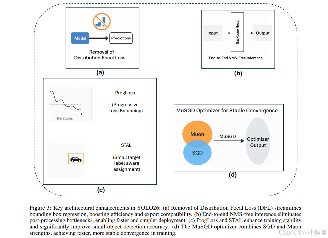 YOLO26引入了多项关键架构创新,使其区别于前几代YOLO模型。这些增强不仅提高了训练稳定性和推理效率,还从根本上重塑了实时边缘设备的部署流程。本节将详细描述YOLO26的四项主要贡献:(i)移除分布焦点损失(DFL),(ii)引入端到端无NMS推理,(iii)新颖的损失函数策略,包括渐进损失平衡(ProgLoss)和小目标感知标签分配(STAL),以及(iv)开发用于稳定高效收敛的MuSGD优化器。我们将详细讨论每一项架构增强,并通过对比分析突显其相对于YOLOv8、YOLOv11、YOLOv12和YOLOv13等早期YOLO版本的优势。