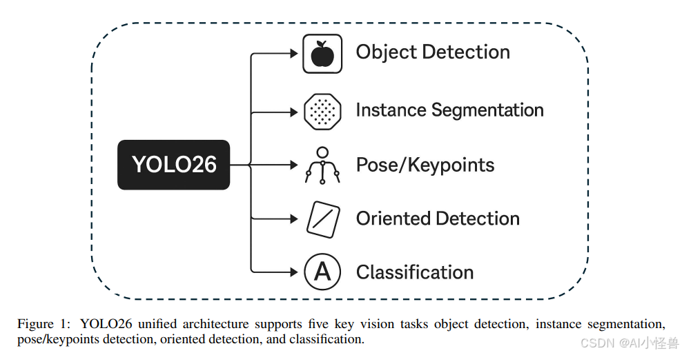 从功能上看,如图1再次强调,YOLO26的五项能力共享统一的主干/颈部和流线型头部: