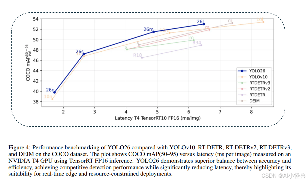 YOLO26的一个主要贡献在于其对部署优势的强调。该模型的架构为实际使用进行了刻意优化:通过省略DFL和NMS,YOLO26避免了在专用硬件加速器上难以实现的操作,从而提高了跨设备的兼容性。该网络可导出为多种格式,包括ONNX、TensorRT、CoreML、TFLite和OpenVINO,确保开发人员能够同样轻松地将其集成到移动应用、嵌入式系统或云服务中。至关重要的是,YOLO26还支持鲁棒的量化:由于其简化的架构能够容忍低位宽推理,它可以在INT8量化或半精度FP16下部署,而对精度影响最小。这意味着模型可以被压缩和加速,同时仍能提供可靠的检测性能。这些特性转化为实际的边缘性能提升------从无人机到智能摄像头,YOLO26可以在CPU和小型设备上实时运行,而先前的YOLO模型在这些设备上表现挣扎。所有这些改进都展示了一个总体主题:YOLO26弥合了前沿研究理念与可部署AI解决方案之间的差距。这种方法强调了YOLO26作为学术创新与行业应用之间桥梁的角色,将最新的视觉进步直接交到实践者手中。