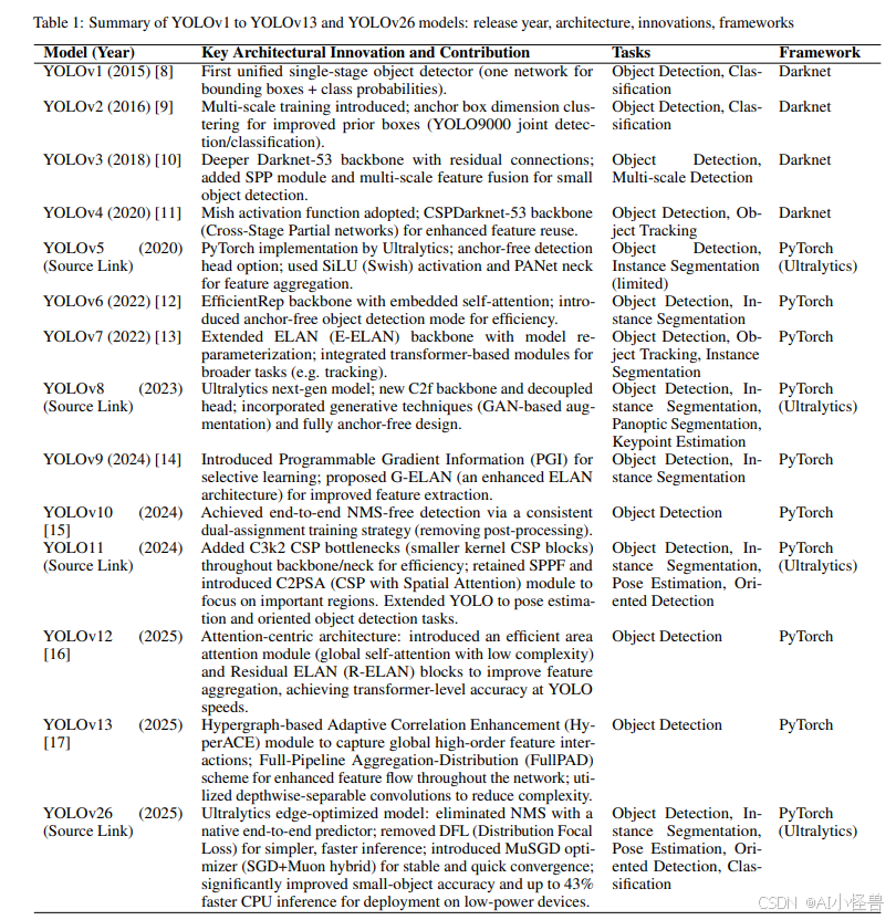 目标检测已成为计算机视觉领域最为关键的任务之一,使得机器能够在图像或视频流中定位并分类多个物体[1, 2]。从自动驾驶、机器人技术到安防监控、医疗成像、农业和智能制造,实时目标检测算法构成了众多人工智能(AI)应用的基石[3, 4]。在这些算法中,"你只看一次"(YOLO)系列模型凭借其精度与前所未有的推理速度,确立了自身在实时目标检测领域最具影响力的地位[5, 6, 7, 7]。自2016年问世以来,YOLO历经多次架构修订,每一代都致力于解决前代的局限,并融合神经网络设计、损失函数和部署效率方面的尖端进展[5]。2025年9月发布的YOLO26代表了这一演进历程的最新里程碑,它引入了架构简化、新型优化器以及专为低功耗设备增强的边缘部署能力。