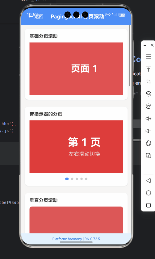horizontal属性设置为true,实现水平分页;若需垂直分页,设为falsepagingEnabled是关键属性,启用后ScrollView会自动将内容对齐到页面边界showsHorizontalScrollIndicator={false}隐藏滚动指示器,提升视觉体验- OpenHarmony适配要点:在OpenHarmony 3.1+设备上,必须确保每个页面的宽度为整数,避免因浮点数计算导致对齐不精确