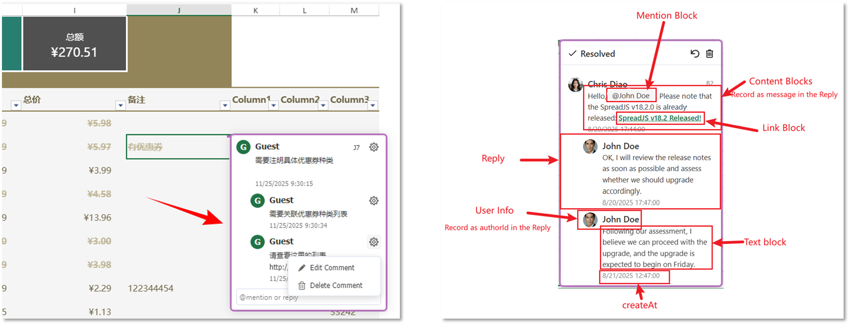 依托 SpreadJS 强大的协同框架,评论新特性实现全场景实时协作:用户可即时回复、编辑或删除自己的评论/回复,操作结果同步至所有协作端,无需手动刷新。更实用的是 @提及功能,在回复中标记协作者姓名即可触发通知机制,确保关键人员及时接收任务提醒------比如财务人员在报表中@审计同事核实数据,对方能快速定位至对应单元格参与讨论,大幅缩短沟通响应周期。