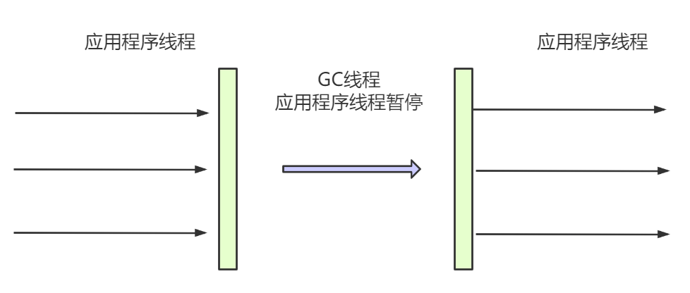在串行收集器进行垃圾回收时,Java应用程序中的线程都需要暂停,等待垃圾回收的完成。如图所示,在串行回收器运行时,应用程序中的所有线程都停止工作,进行等待。