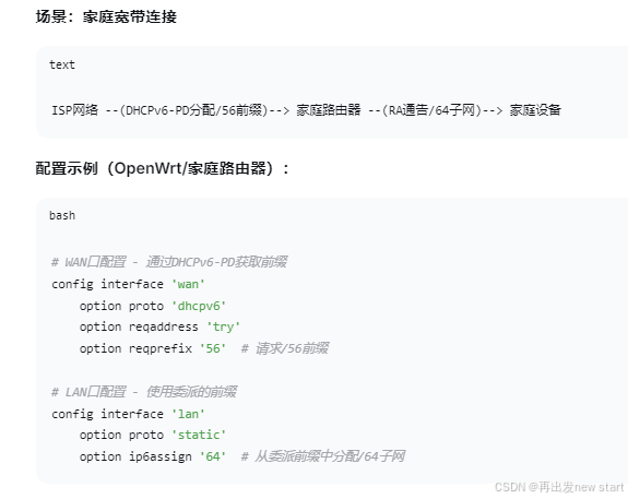 总结:RA 用于主机地址自动配置,DHCPv6-PD用于路由器之间的前缀委派管理。两者配合,构建了层次化的 IPv6 地址分配体系。