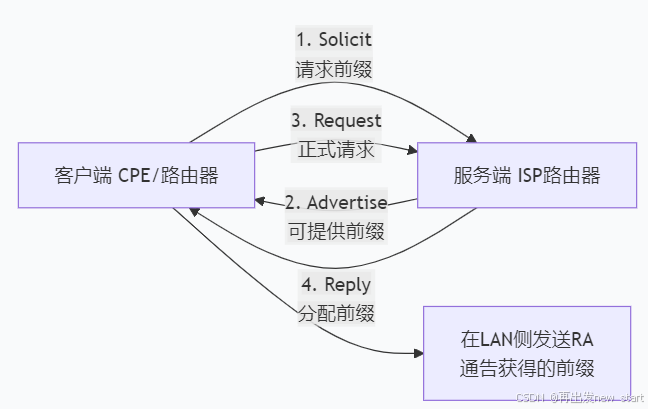 IPv6前缀委派使用DHCPv6 的扩展协议,具体过程如下: