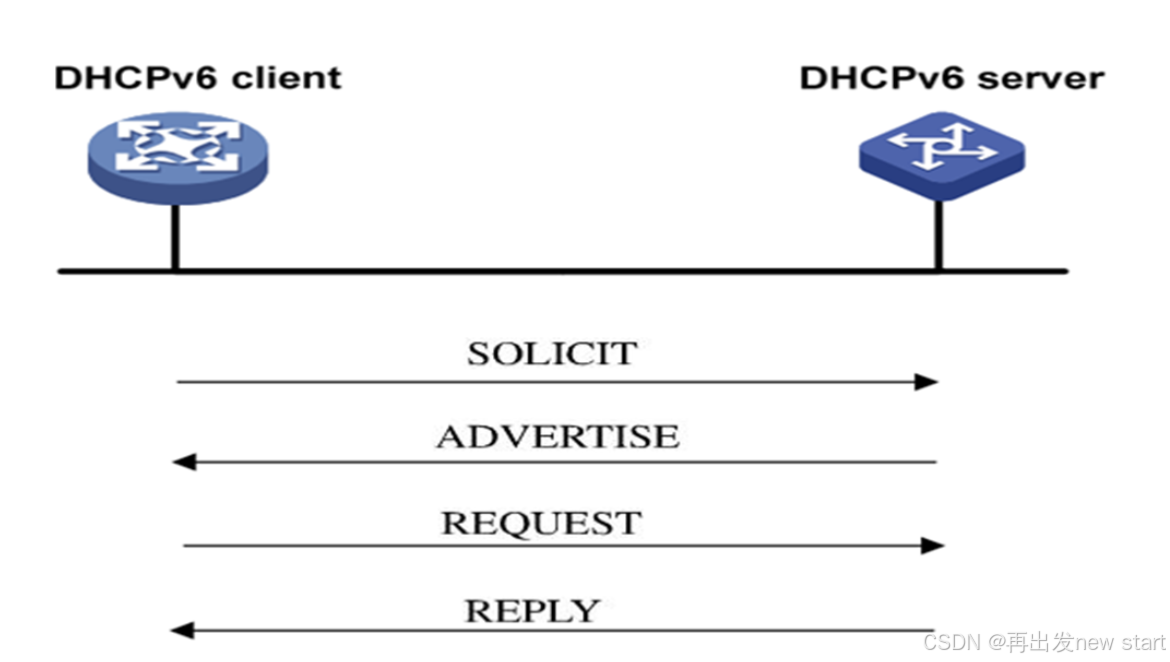 ff02::1:2(所有DHCPv6中继代理和服务器)发送 Solicit 报文,开始标准的 DHCPv6四步交换(Solicit, Advertise, Request, Reply)或两步交换(Solicit, Reply),从DHCPv6服务器获取一个或多个IPv6地址、DNS服务器等完整信息。