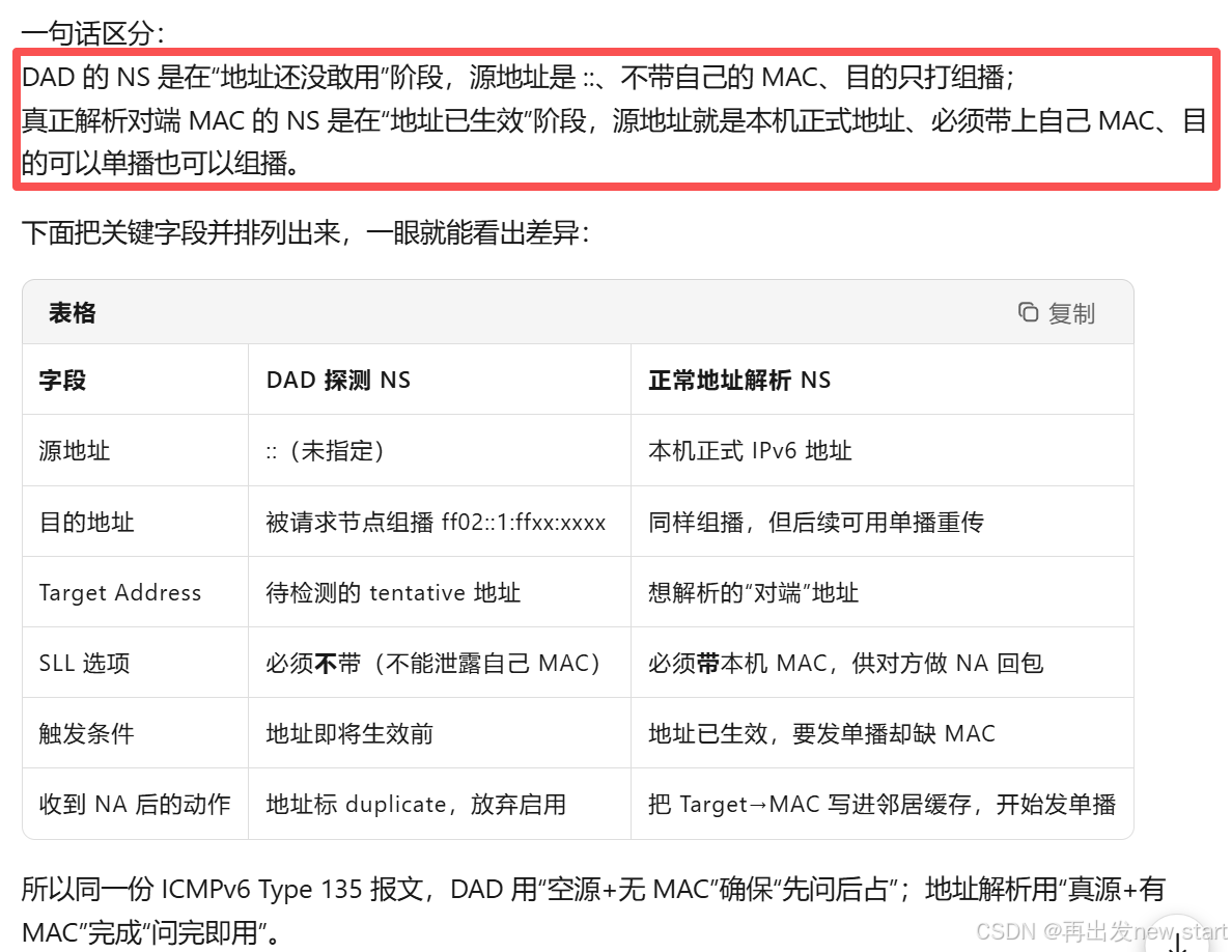 重复地址检测(DAD):主机在给自己配置一个地址前,先询问这个地址是否已被占用。("有人用2001:db8::1吗?我要用。")