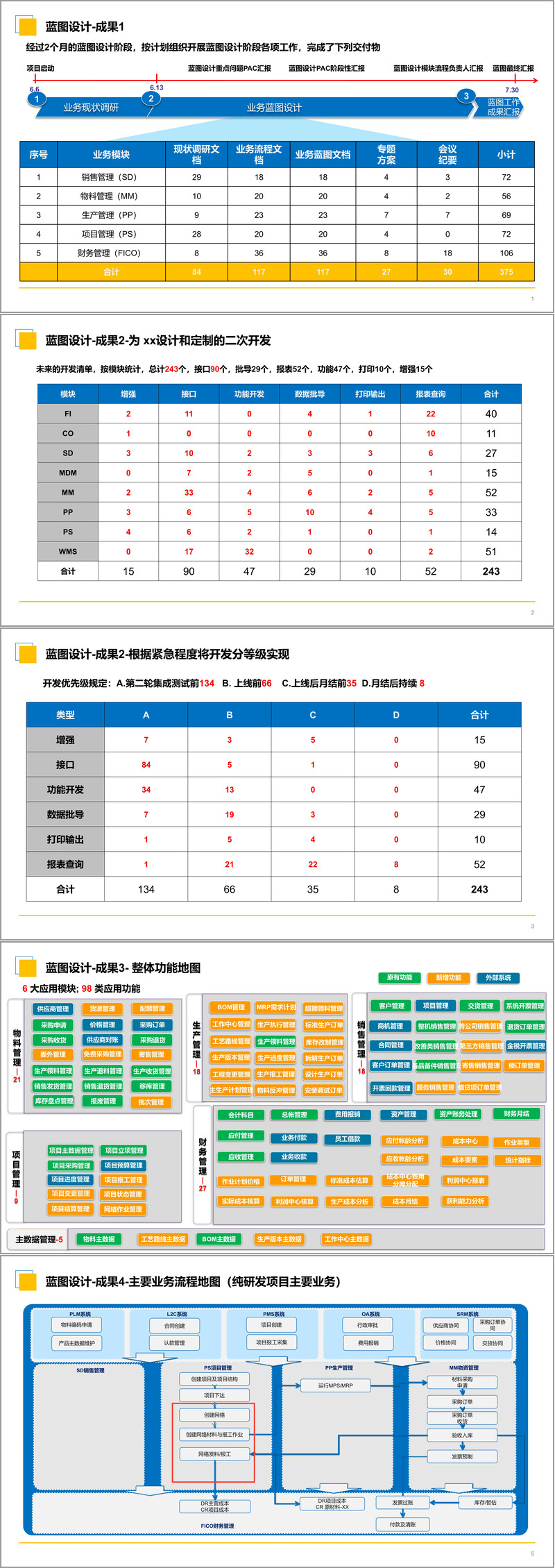 二次开发规划: 为满足企业个性化需求,共规划了243个开发项,并根据紧急程度划分为四个优先级(如集成测试前完成、上线前完成等),确保了开发工作的有序进行。