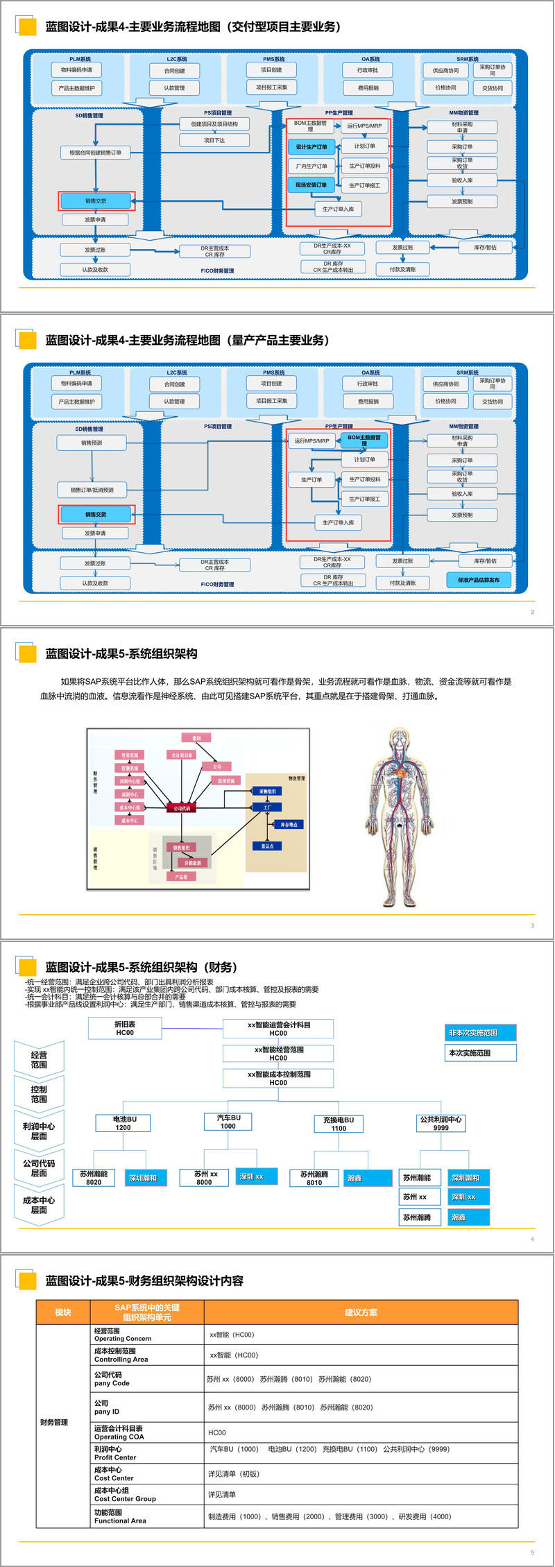 系统组织架构设计: 将SAP系统平台比喻为人体,其组织架构是"骨架",业务流程是"血脉"。文件详细设计了财务、销售和工厂三个维度的组织架构。例如,在财务层面,设计了统一的经营范围、控制范围和会计科目表,以支持跨公司代码的利润分析和成本管控;在销售层面,按业务单元(BU)划分销售组织,并细化到分销渠道和销售组;在工厂层面,明确了库存地点的精细化管理方案。