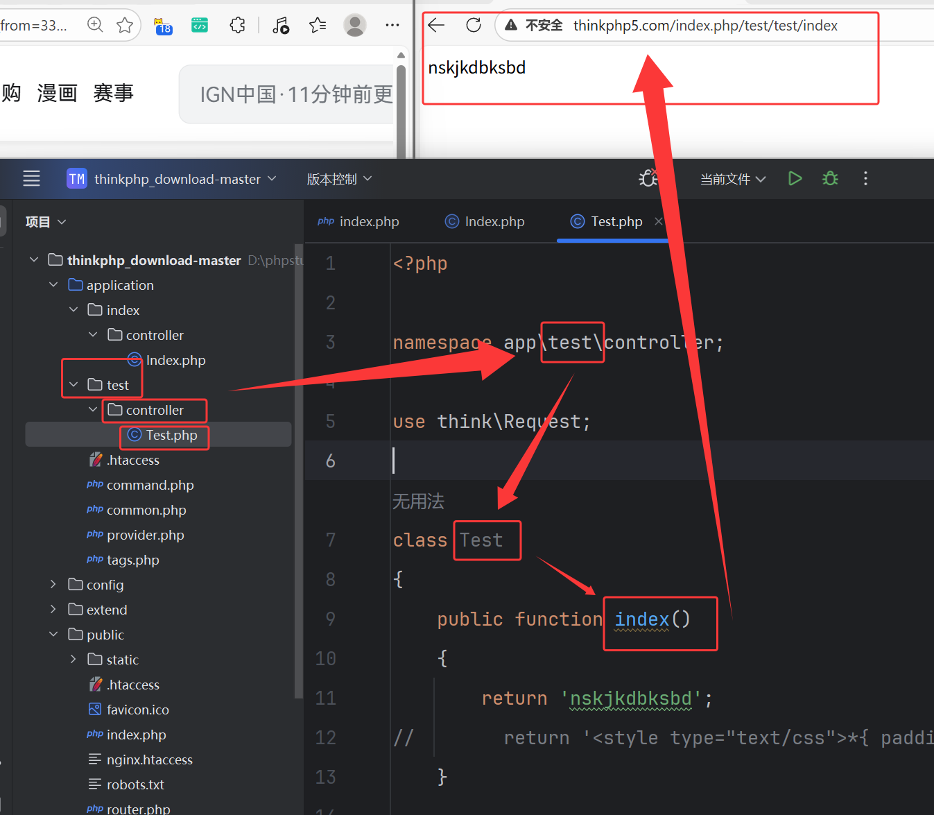 在之前的test/controller/Test.php 改成下面代码