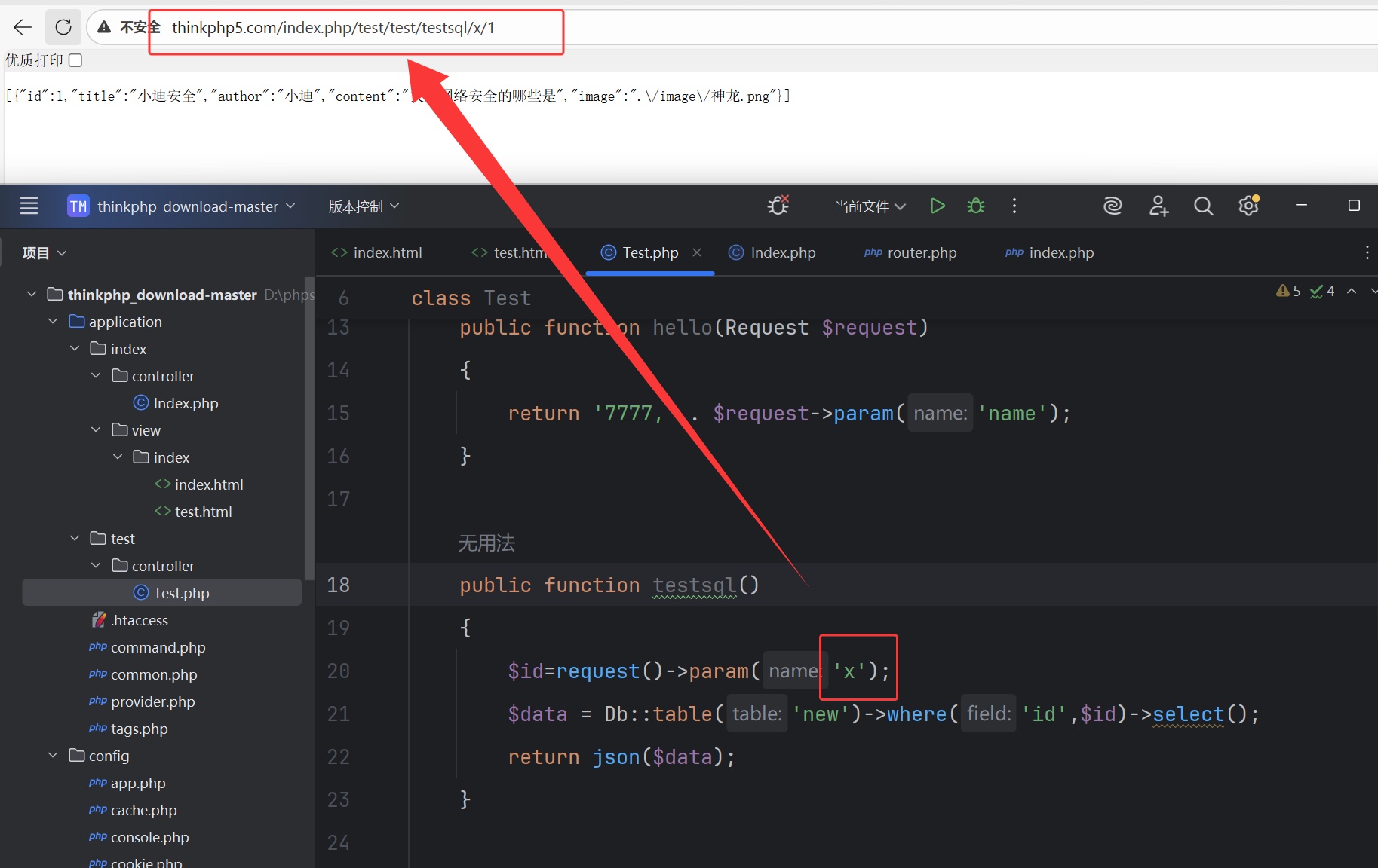 http://thinkphp5.com/index.php/test/test/testsql/x/1