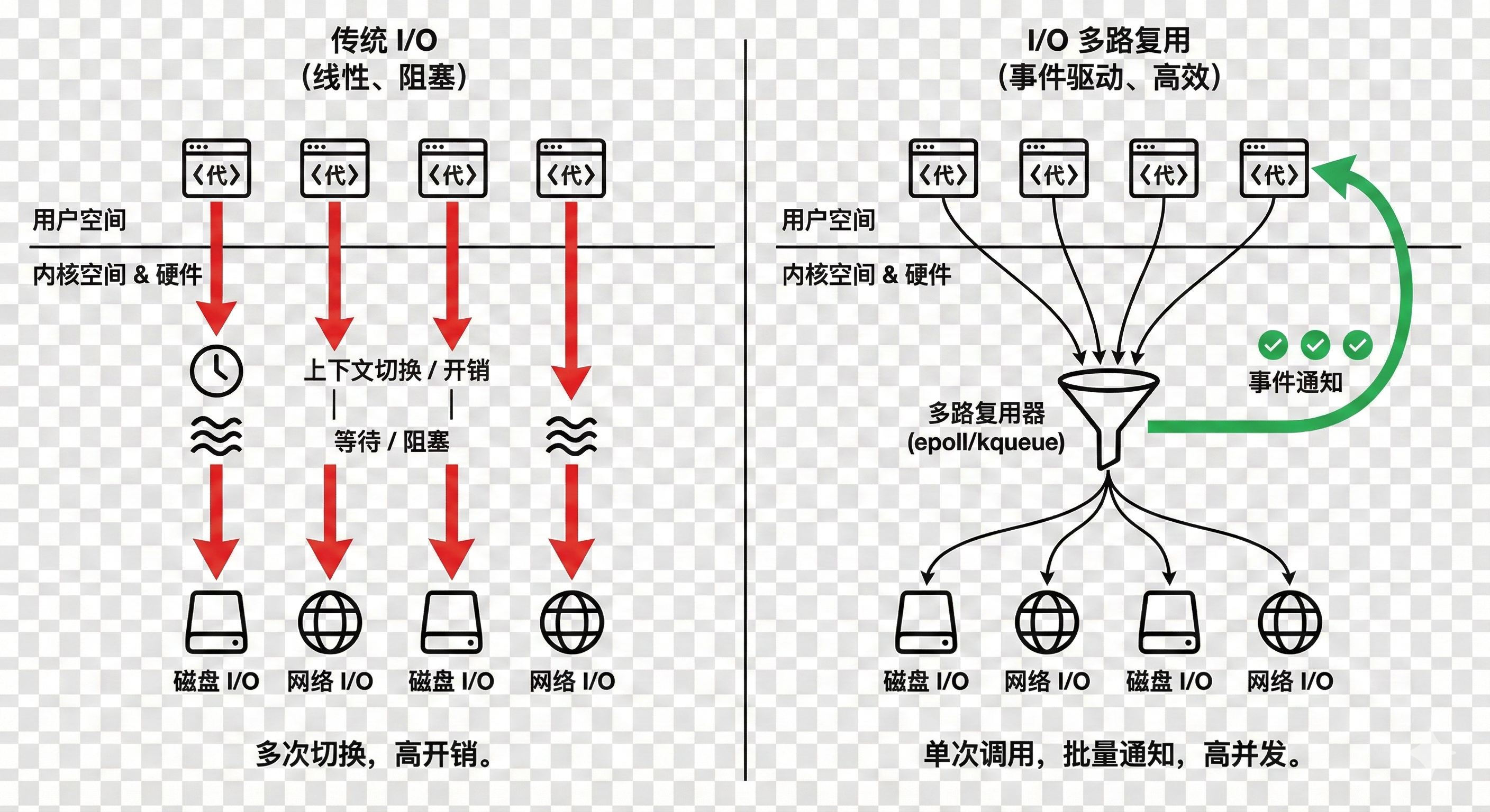 I/O 多路复用(如 epoll)允许单个线程同时监听成千上万个文件描述符,仅在有事件就绪时才批量返回可操作的 fd 列表。这样,系统调用次数从 O(n) 降至 O(1)(均摊),上下文切换和内核-用户空间拷贝大幅减少,CPU 得以集中处理有效数据。