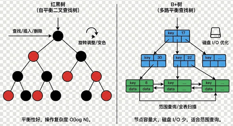另一个场景是使用红黑树或普通二叉搜索树存储海量键值对。当数据规模超出内存容量,树节点不得不换出到磁盘。此时,树的高度(O(log n))虽看似合理,但每下降一层都可能触发一次磁盘 I/O。对于十亿级数据,log₂(10⁹) ≈ 30,意味着一次查找可能引发 30 次磁盘访问。而磁盘的随机 I/O 吞吐极低,延迟极高,整个查询过程几乎完全被 I/O 阻塞。即便数据全在内存中,若节点分散分配,缓存行利用率也会极差,进一步加剧 memory-bound。