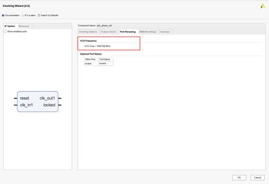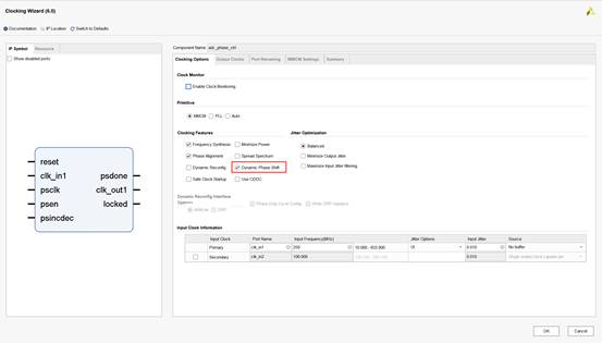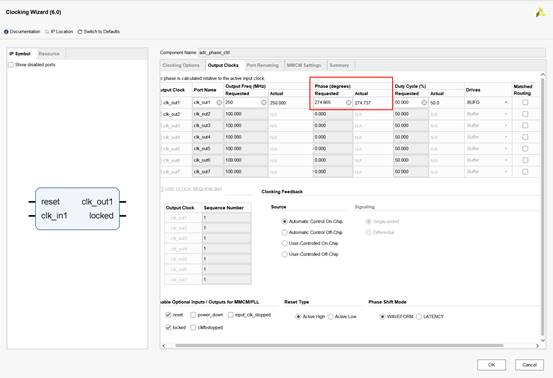 测试阶段控制逻辑通过VIO进行微调。psen每变化1次,时钟偏移为18ps,相位偏移为18ps/1000ps *360 = 6.48度。所以根据psen的变化次数,确定相位偏移的角度。最后在将此角度初始化到MMCM之中,即可完成对初始化相位的调整。