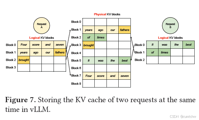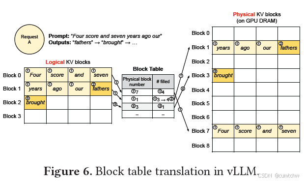 一个request的KV Cache是可以代表一系列的逻辑KV blocks,GPU的blcok engine会一次性的申请一大块的显存,然后把这一大块显存分成多块物理的KV blocks,并且会映射成逻辑的地址,然后必要的时候还会swap到cpu的内存。
