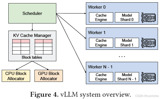 在本工作中,我们开发了一种新的注意力算法PagedAttention,并构建了一个LLM服务引擎vLLM,以应对§3中概述的挑战。vLLM的架构如图4所示。vLLM采用集中式调度器来协调分布式GPU worker的执行。KV缓存管理器通过PagedAttention以分页方式有效管理KV缓存。具体来说,KV缓存管理器通过集中式调度器发送的指令来管理GPU worker上的物理KV缓存内存。