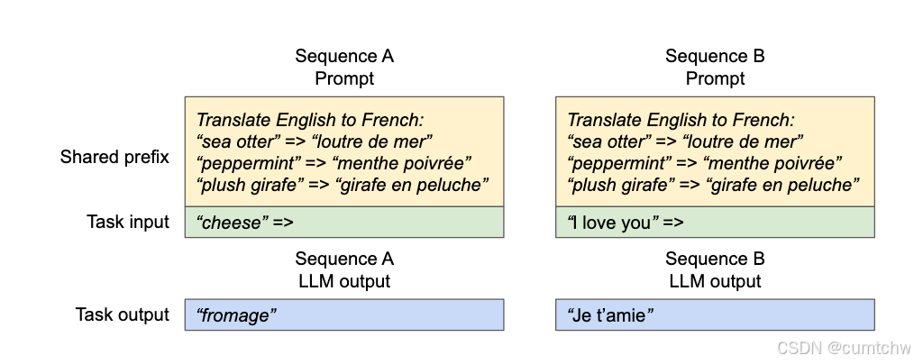 在许多提示工程实践中,多个请求会以相同的系统提示或 few-shot 示例开头(例如翻译任务中的多个例句)。这些共享前缀同样可以被 vLLM 缓存并复用。