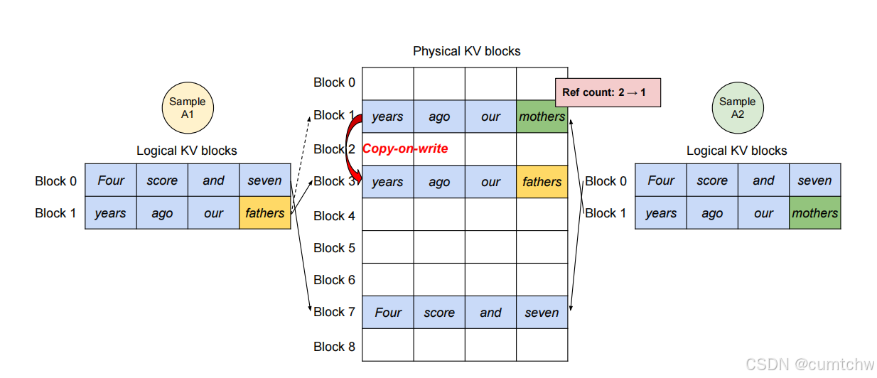 在 vLLM 中,这些采样序列共享相同的 prompt,其对应的 KV Cache 也可以共用同一组物理块。PagedAttention 通过引用计数和 block-level 的 copy-on-write 机制实现共享与隔离的平衡:只有当序列出现不同分支时,才会触发复制操作。