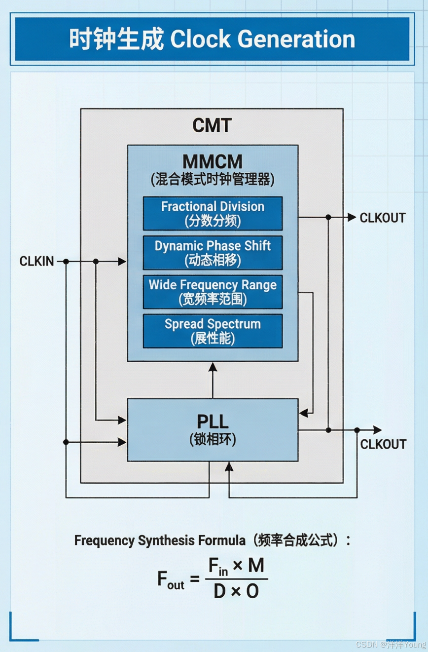 此设计允许用户根据需求灵活选择:若无需 MMCM 提供的全部高级功能(如动态相位调整、分数分频等),则可使用面积更小的 PLL,从而释放出芯片空间。