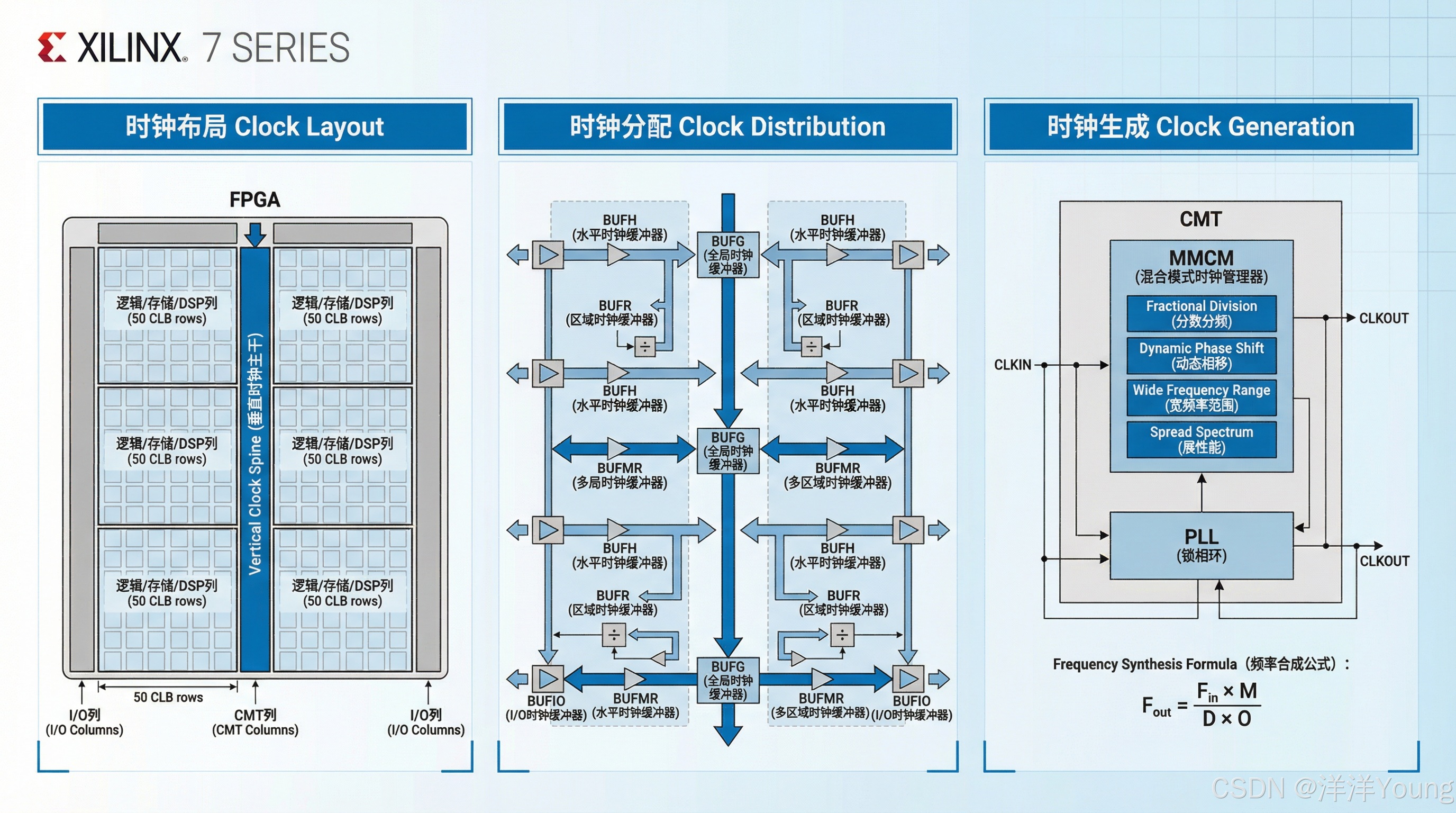 Xilinx 7 系列 FPGA 基于 Virtex-6 的时钟架构,采用全系列统一的时钟系统,CMT 列与 I/O 列相邻,以支持高性能接口;每个时钟区域高度统一,包含 50 行 CLB;并且全局时钟资源优化,降低功耗。