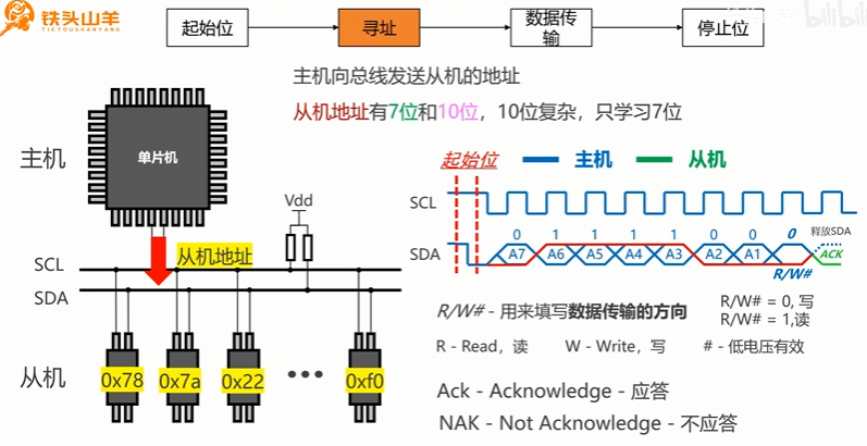 每个从机都有一个地址,主机通过SCL控制着节奏的频率,主机通过控制SDA电平的高低变换,产生七位的0/1数据、一位的数据传输方向,从机产生一位的应答。