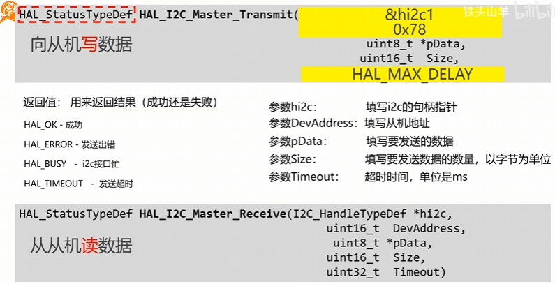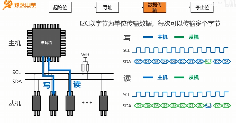 - 主机和从机各有SCL、SDA引脚,两种引脚各自与I2C总线的SCL、SDA引脚相连;