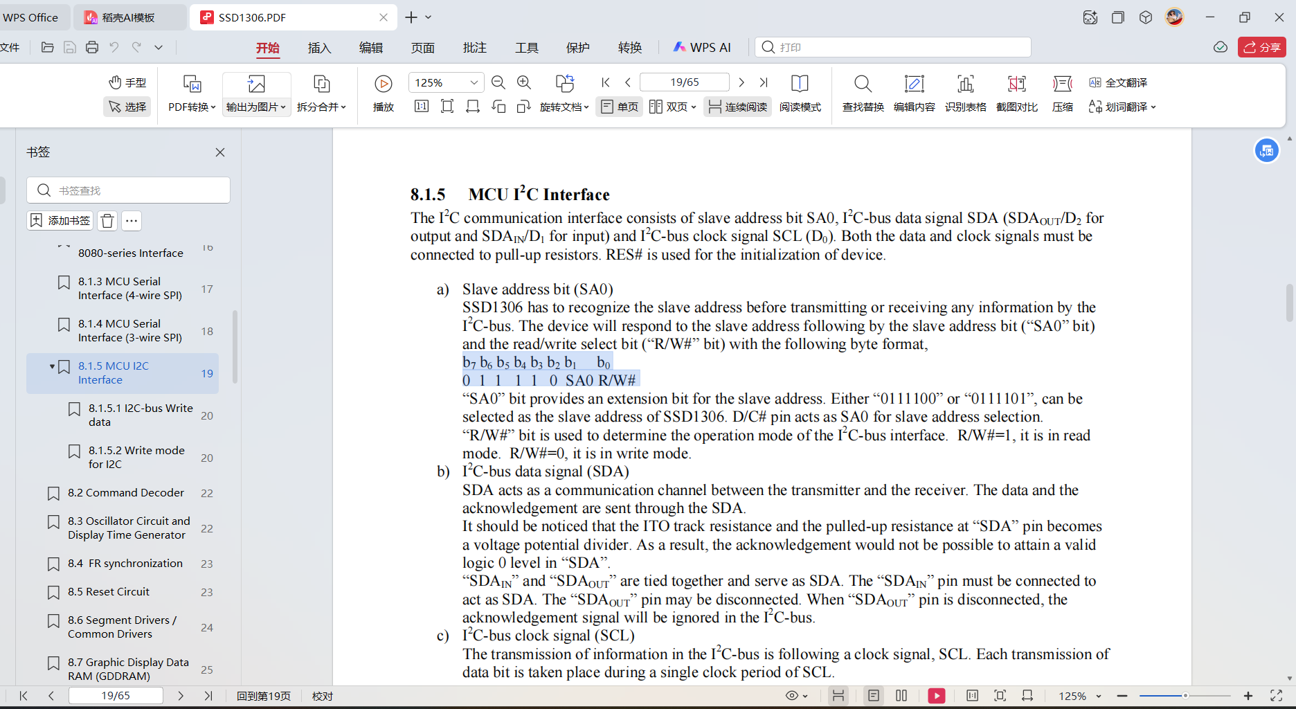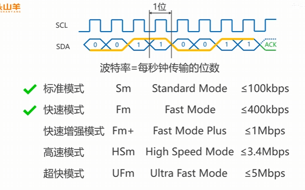 - SCL负责传输高低变化的方波信号,每个时钟周期传输一位,所以时钟的频率越高,传输的速率越快。