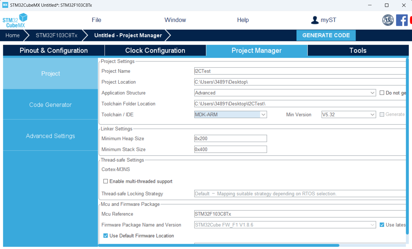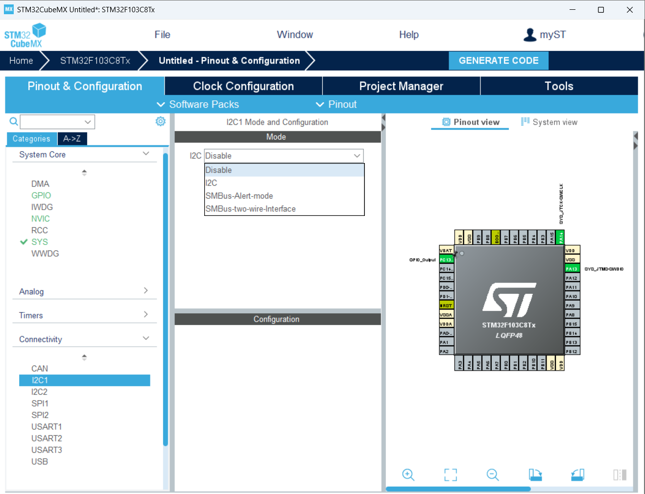 CubeMX新建项目------选型号------选调试接口------配置PC13引脚(板载LED,跟前几次操作相同)------设置I2C接口