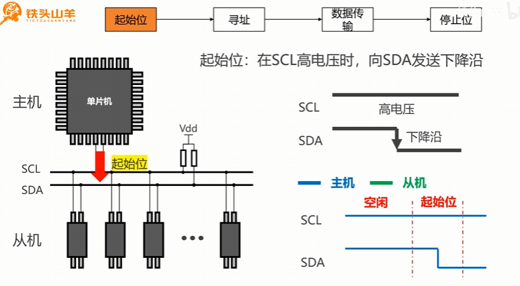 主机控制SCL恒定为高电压,SDA产生下降沿