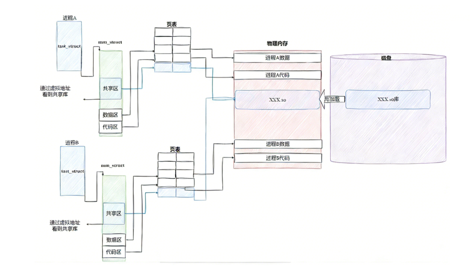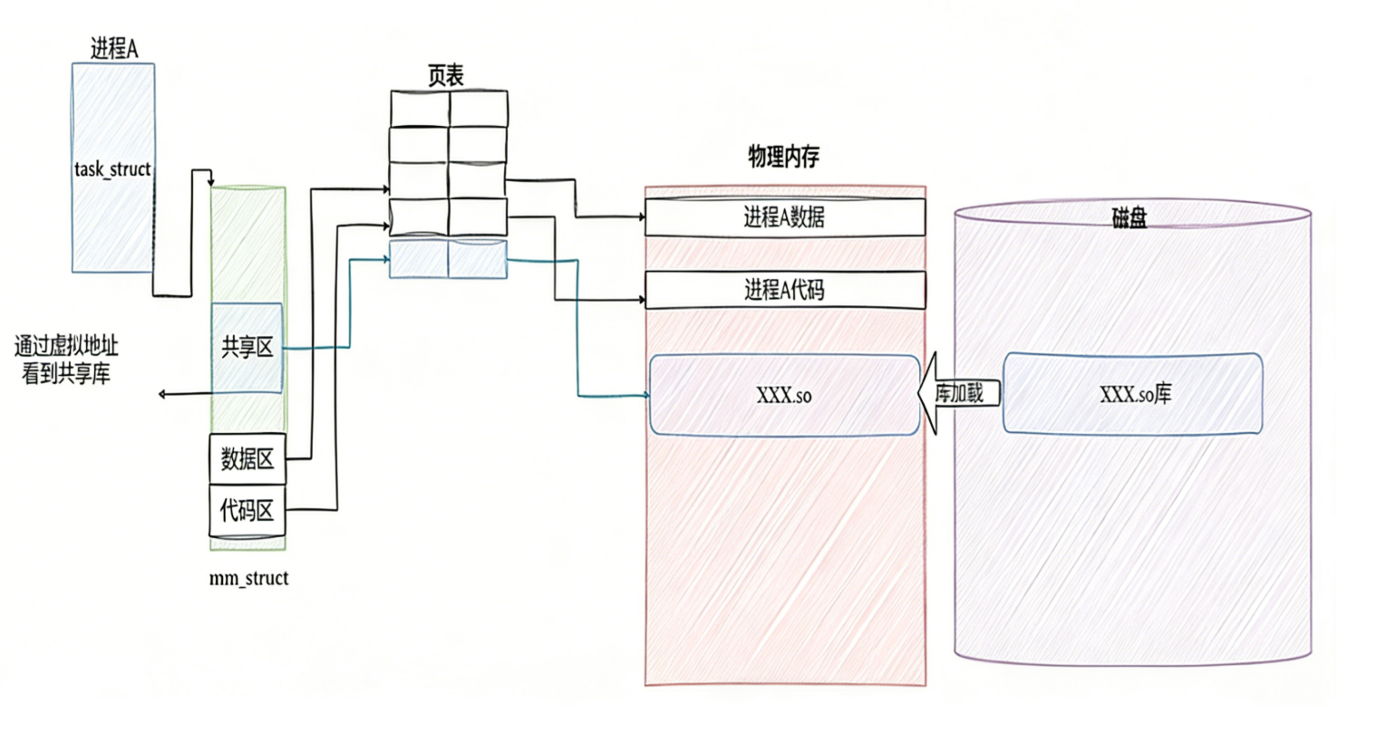 - 而且:整个调用过程,是从代码区跳转到共享区,调用完毕在返回到代码区,整个过程完全在进程地址空间中进行的.