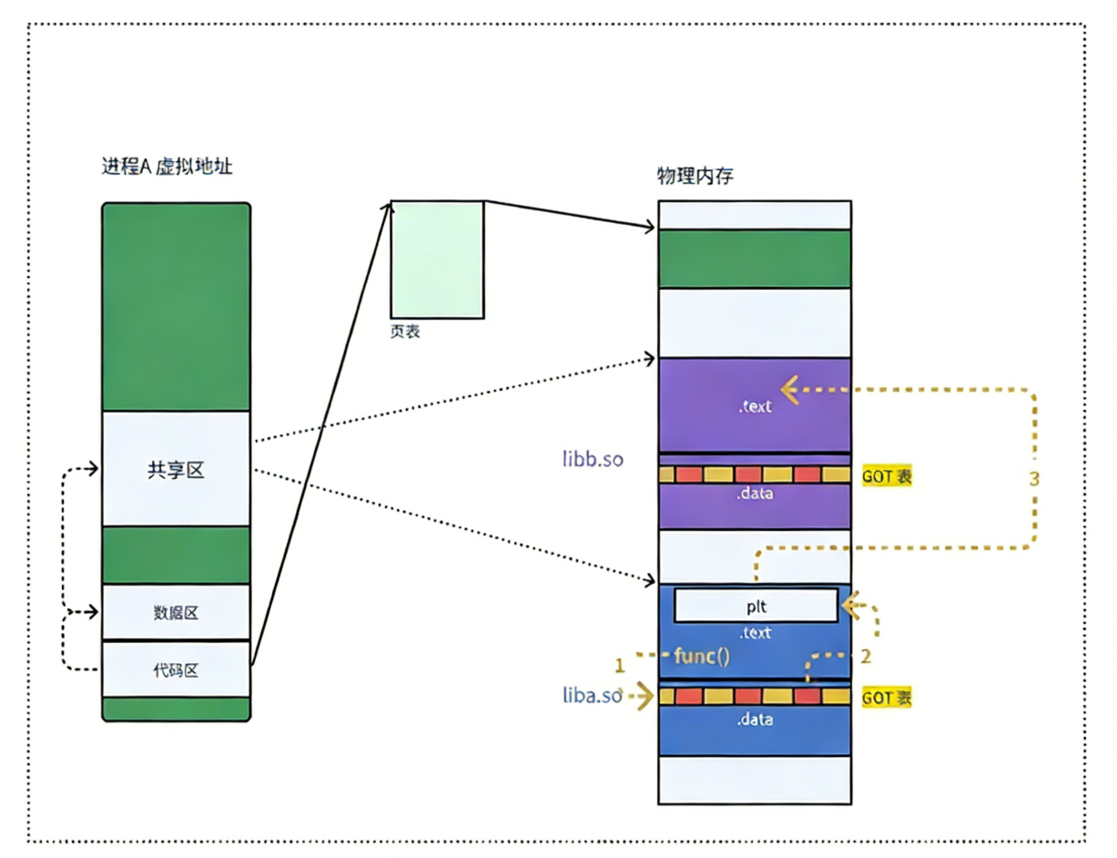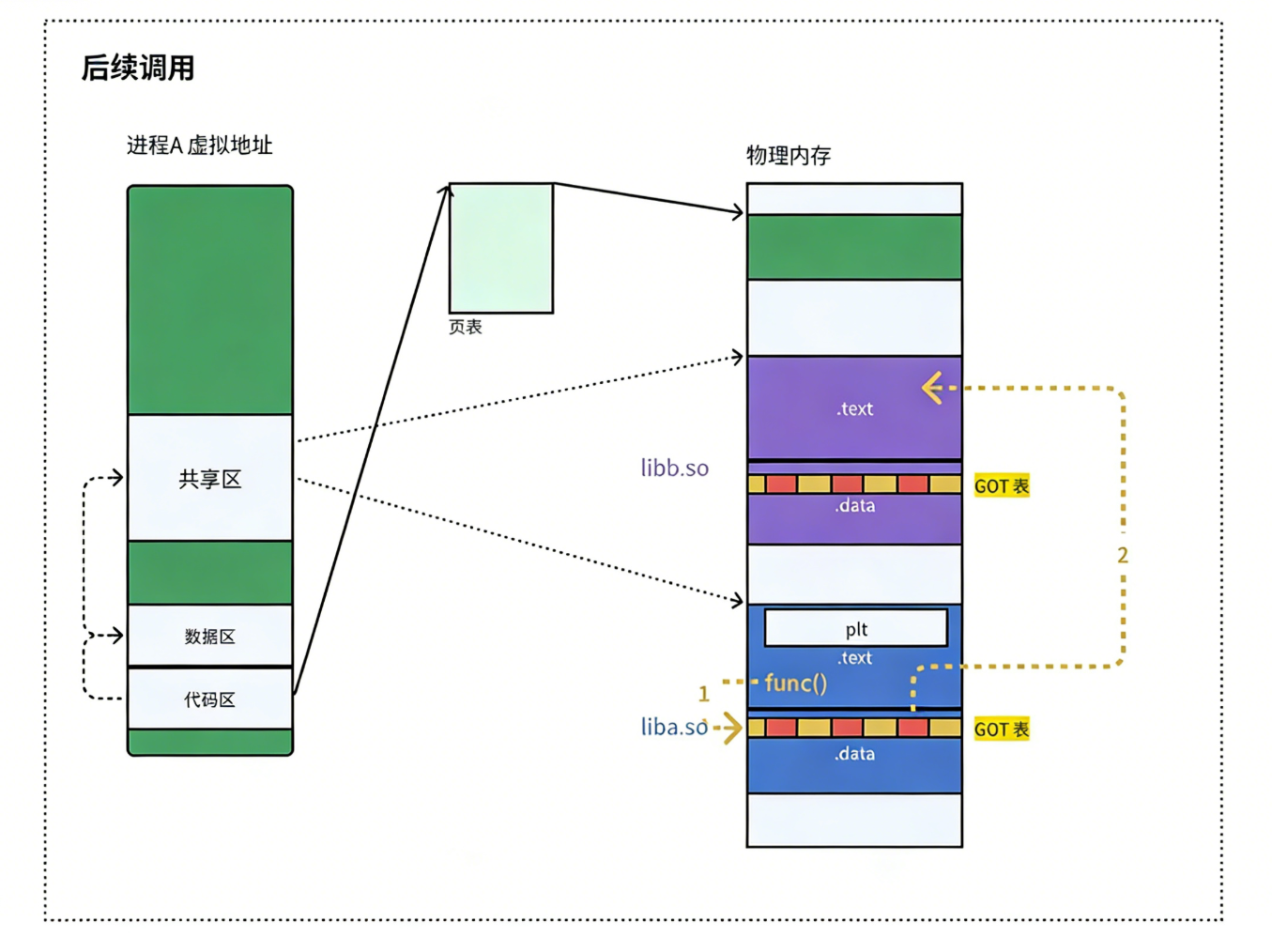 - 由于代码段只读,我们不能直接修改代码段。但有了 GOT 表,代码便可以被所有进程共享。但在不同进程的地址空间中,各动态库的绝对地址、相对位置都不同。反映到 GOT 表上,就是每个进程的每个动态库都有独立的 GOT 表,所以进程间不能共享 GOT 表。