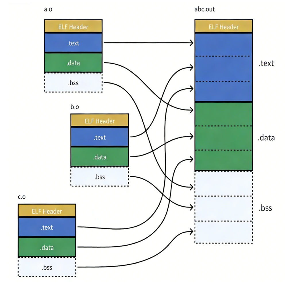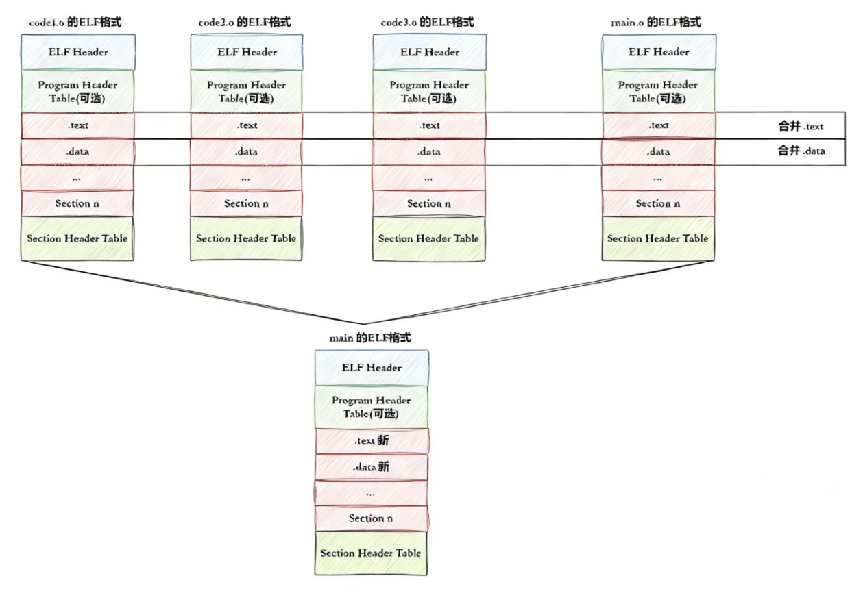 - 节(Section):ELF 文件的基本组成单位,存储特定类型的数据。各类信息与数据分置于不同节中,例如代码节存放可执行代码,数据节存放全局变量和静态数据等。