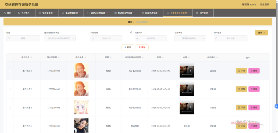 该交通管理在线服务系统基于SpringBoot框架构建,具备丰富且实用的功能。在用户信息管理方面,支持用户信息的新增与修改操作,方便对系统用户的基本信息进行维护,确保用户信息的准确性和及时性。对于驾驶证业务,系统涵盖了驾驶证业务的添加、删除、修改等功能,能够高效处理驾驶证相关的各类业务办理,满足驾驶员在驾驶证业务方面的多样化需求。在机动车业务管理上,可实现机动车业务的修改、删除、添加等操作,助力相关部门对机动车业务进行规范、高效的管理,提升机动车业务办理的效率和质量。此外,系统还具备新闻信息管理功能,支持新闻信息的修改、删除、添加,便于及时发布交通管理相关的新闻资讯,为公众提供最新的交通信息服务。