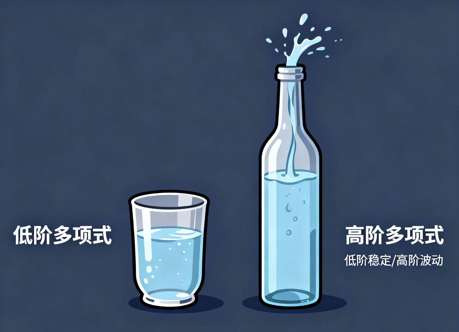 这就像用矮胖的杯子和细高的瓶子倒水:矮胖杯子(低阶多项式)怎么晃都不容易洒;细高瓶子(高阶多项式)稍微一动,水就溅得到处都是。